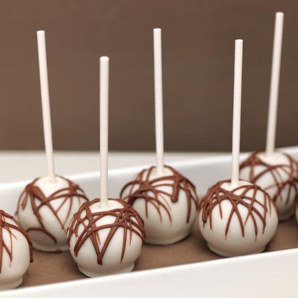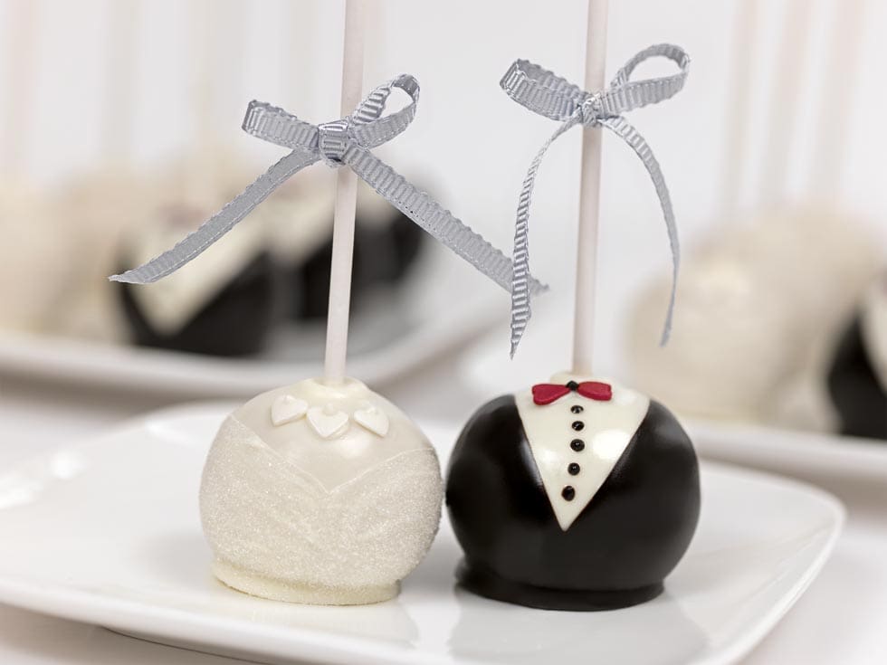 Die Cake Pops für Braut und Bräutigam werden zuerst mit weißen Candy Melts glasiert.