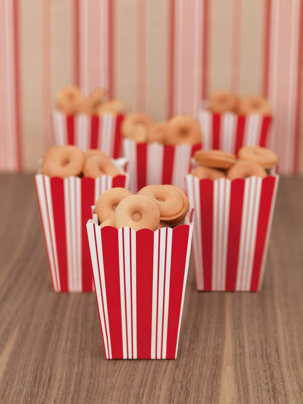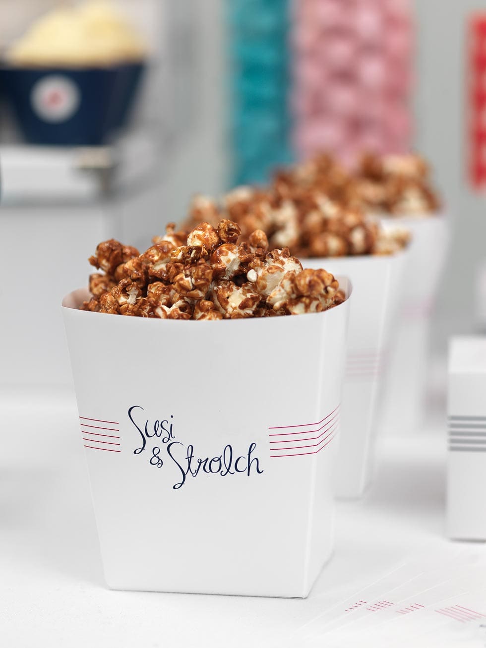 Die Alternative zu Papiertüten sind Snack-Boxen, die ihr entweder zum Selbstbefüllen bereitstellen oder fix und fertig zusammengestellt auf eurer Candy Bar aufstellen könnt.