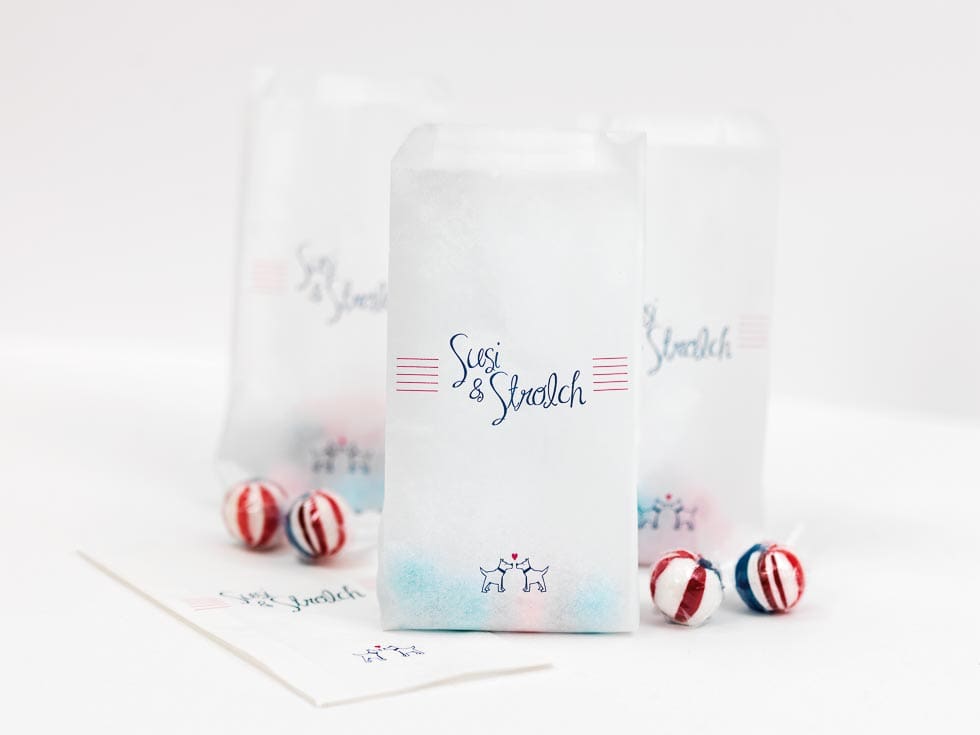 Habt ihr weiße Papiertüten*, könnt ihr diese ganz einfach mit eurem Hochzeitslogo bestempeln oder mit unserem Stempelset zur Hochzeit ganz individuell gestalten.