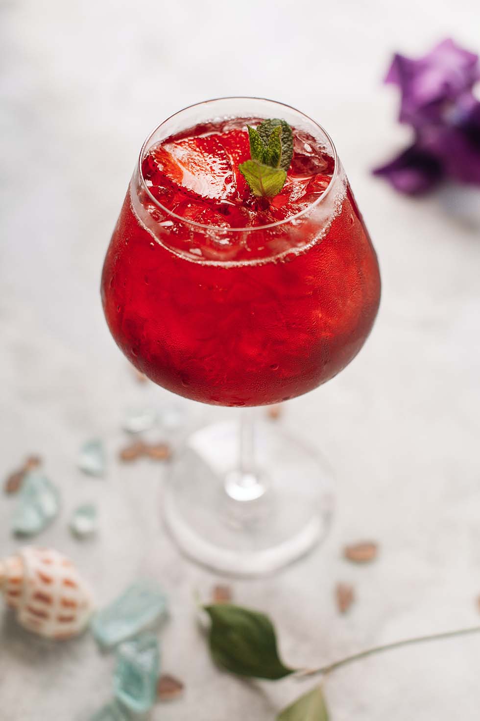 Alle Zutaten mit Eis schütteln und in ein Weinglas gießen. Mit einer Erdbeer-Scheibe dekorieren.