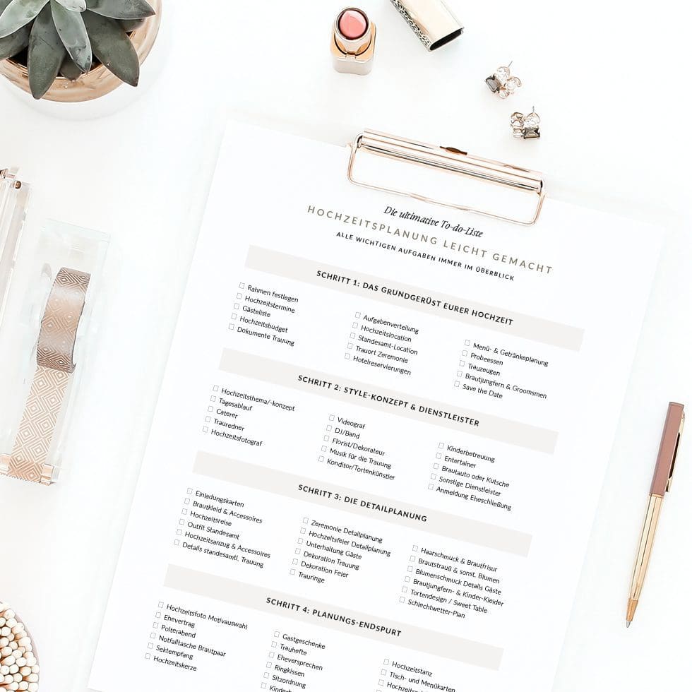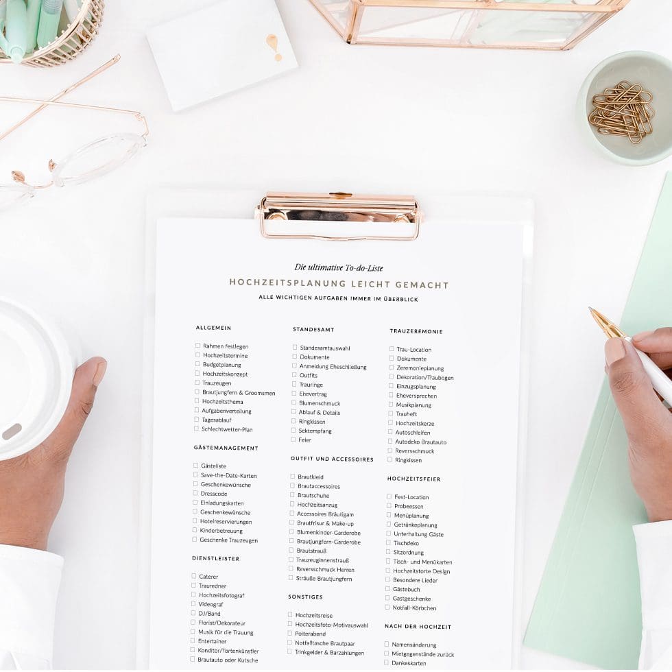 Erhaltet unsere PDF-Checkliste mit allen To-dos für eure Hochzeit inklusive vieler Extratipps für alle Planungspunkte.