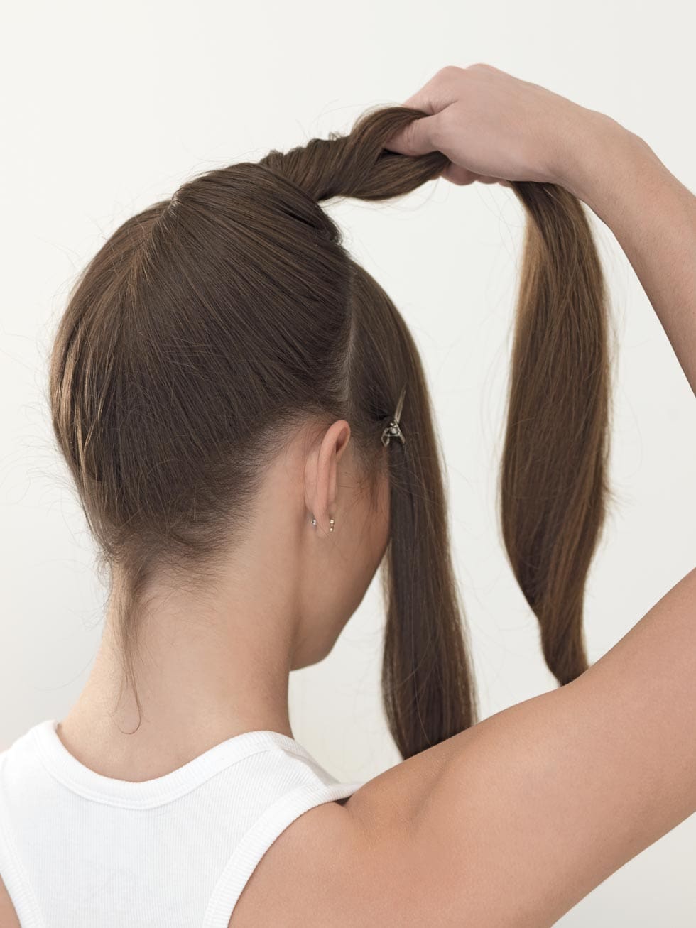 Habt ihr schulterlange Haare, macht einen lockeren Zopf und folgt der Anleitung bis Schritt 3.