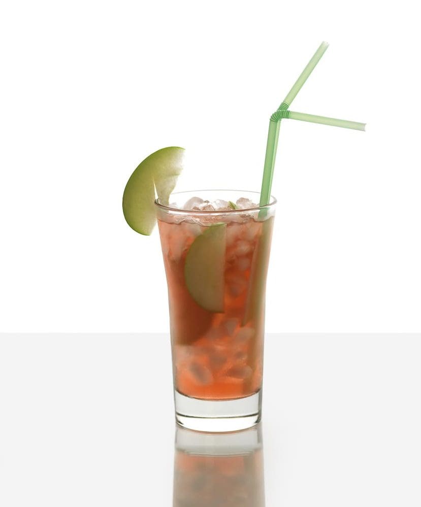 Zitronensaft, Wodka, Apfelschnaps, Puderzucker und Grenadine mixen und kräftig rühren. Zum Schluss Apfelspalten hinzufügen und mit Sodawasser auffüllen.