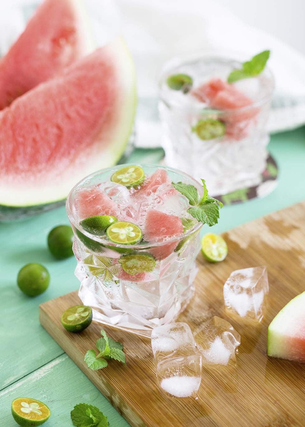 Füllt alles in den Getränkespender und gebt Rum sowie Mineralwasser dazu. Die Melonenstücke und ein paar Deko-Limetten ergänzt jeder Gast selbst.
