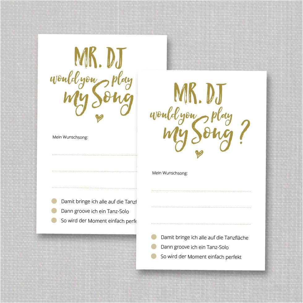 Deshalb ist es sinnvoll, Musikwunschkarten mit einzelnen Liedwünschen zur Verfügung zu stellen. So kann der DJ die einzelnen Songs sortieren und in seiner Playlist berücksichtigen – oder entscheiden, dass er das Lied nicht spielen kann.