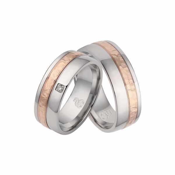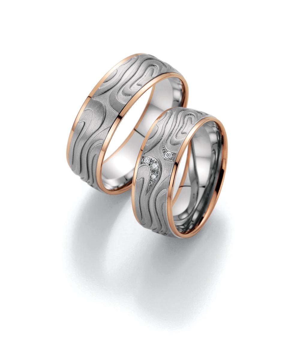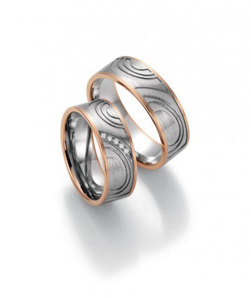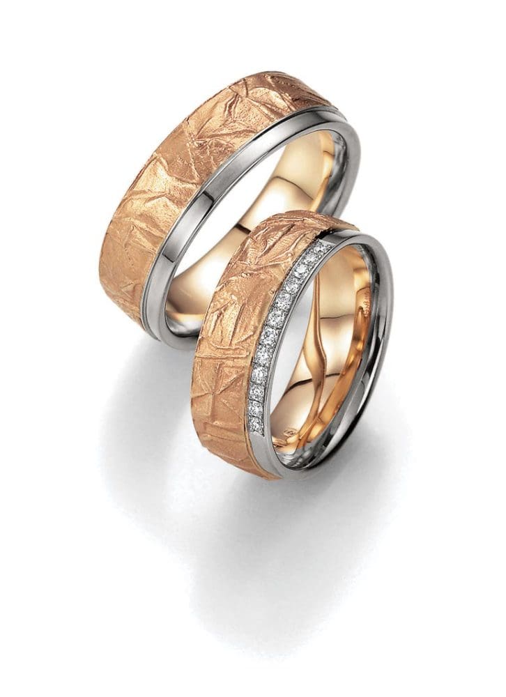 Tolle optische Blickfänge könnt ihr darüber hinaus mit verschnörkelten Mustern oder Strukturen zu euren zweifarbigen Eheringen ergänzen. Denn sogar bereits der Unterschied zwischen einer polierten und matten Oberfläche verändert die Farbe des Metalls.