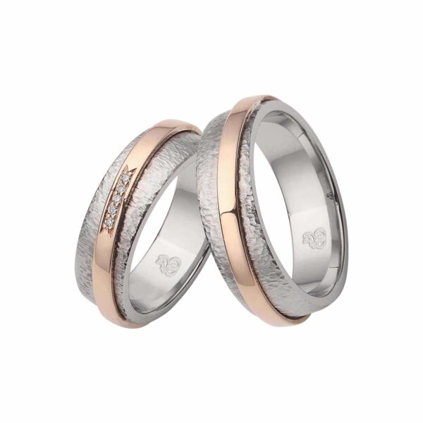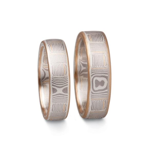 Einen herrlichen Vintage-Charakter erhalten eure Bicolor Eheringe mit dieser Technik, bei der eine dünne Schicht andersfarbiges Edelmetall über die Grundform gelegt wird und anschließend durch Bearbeitung der Oberfläche wieder abgenommen wird.