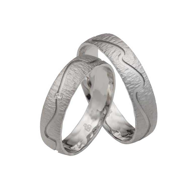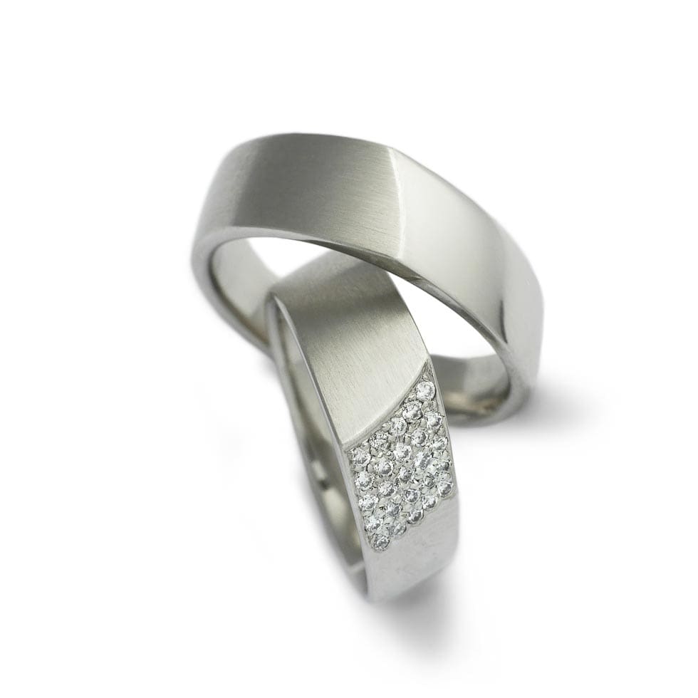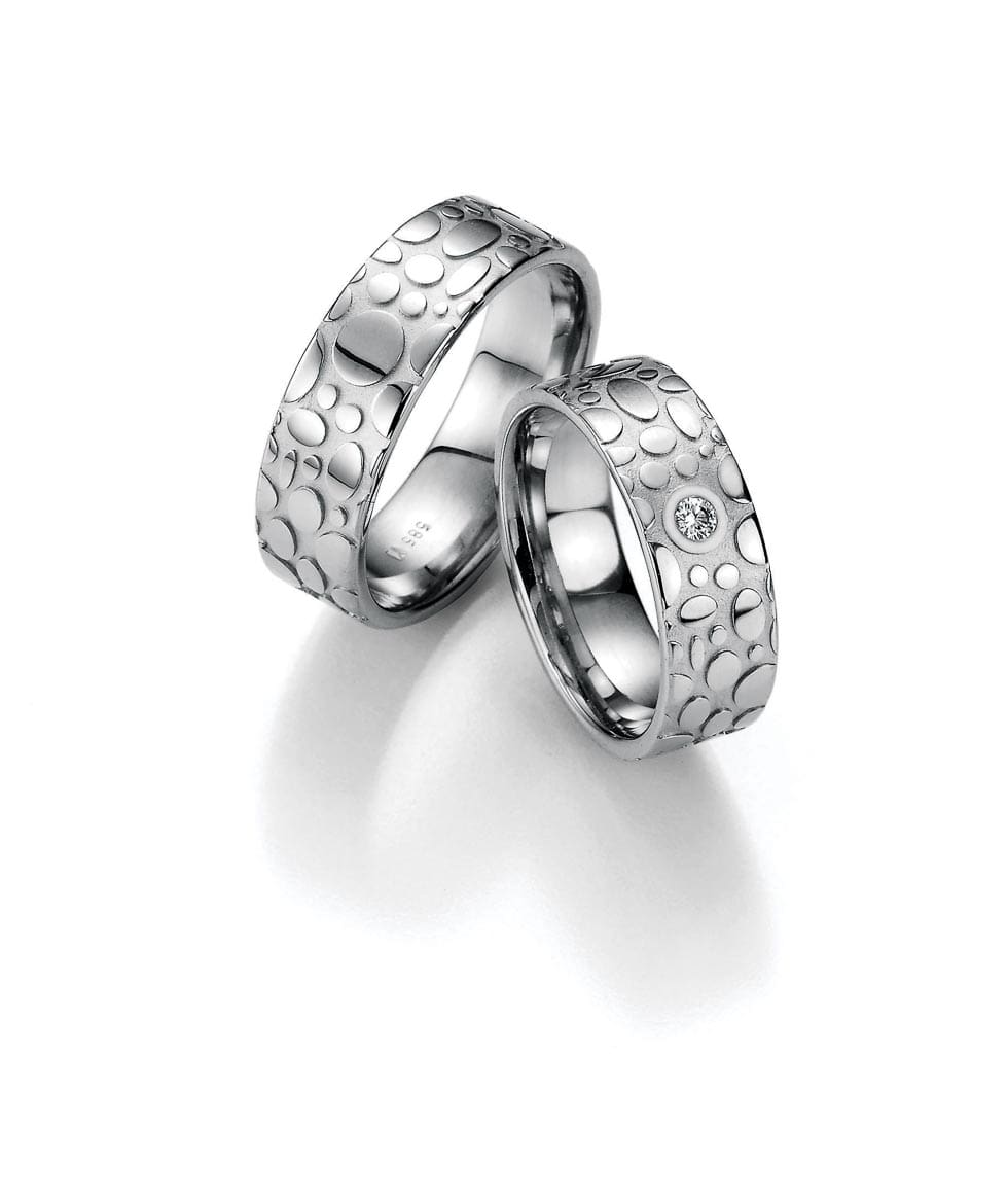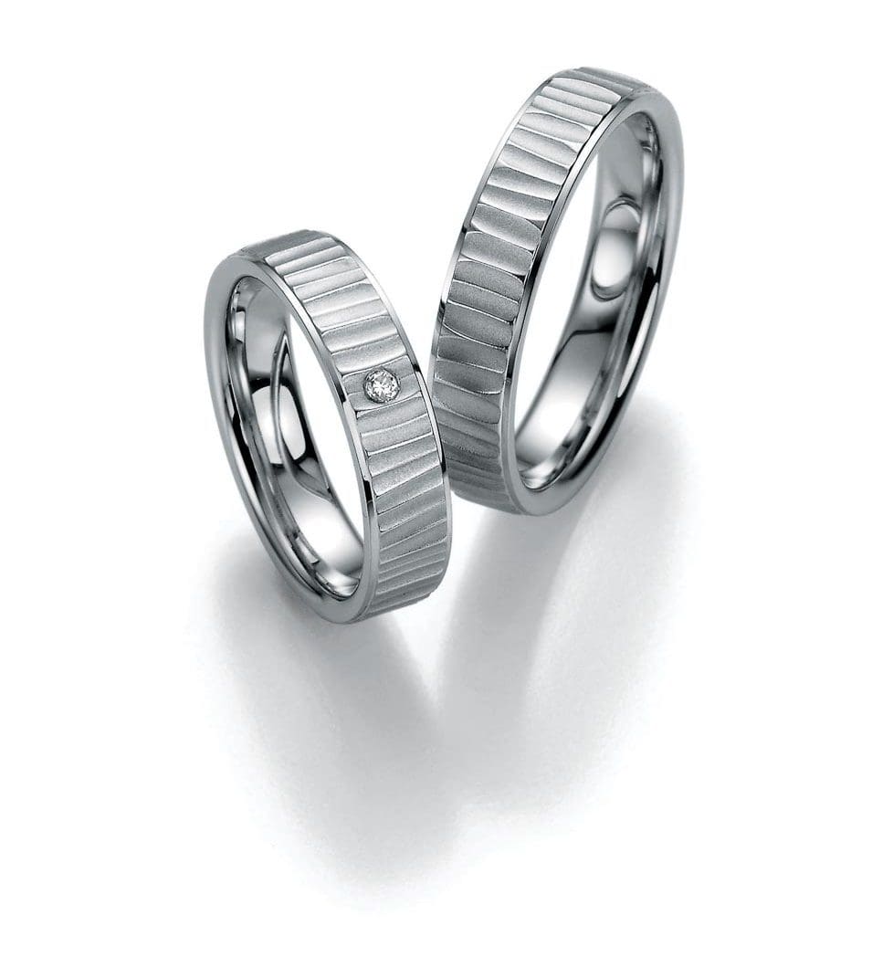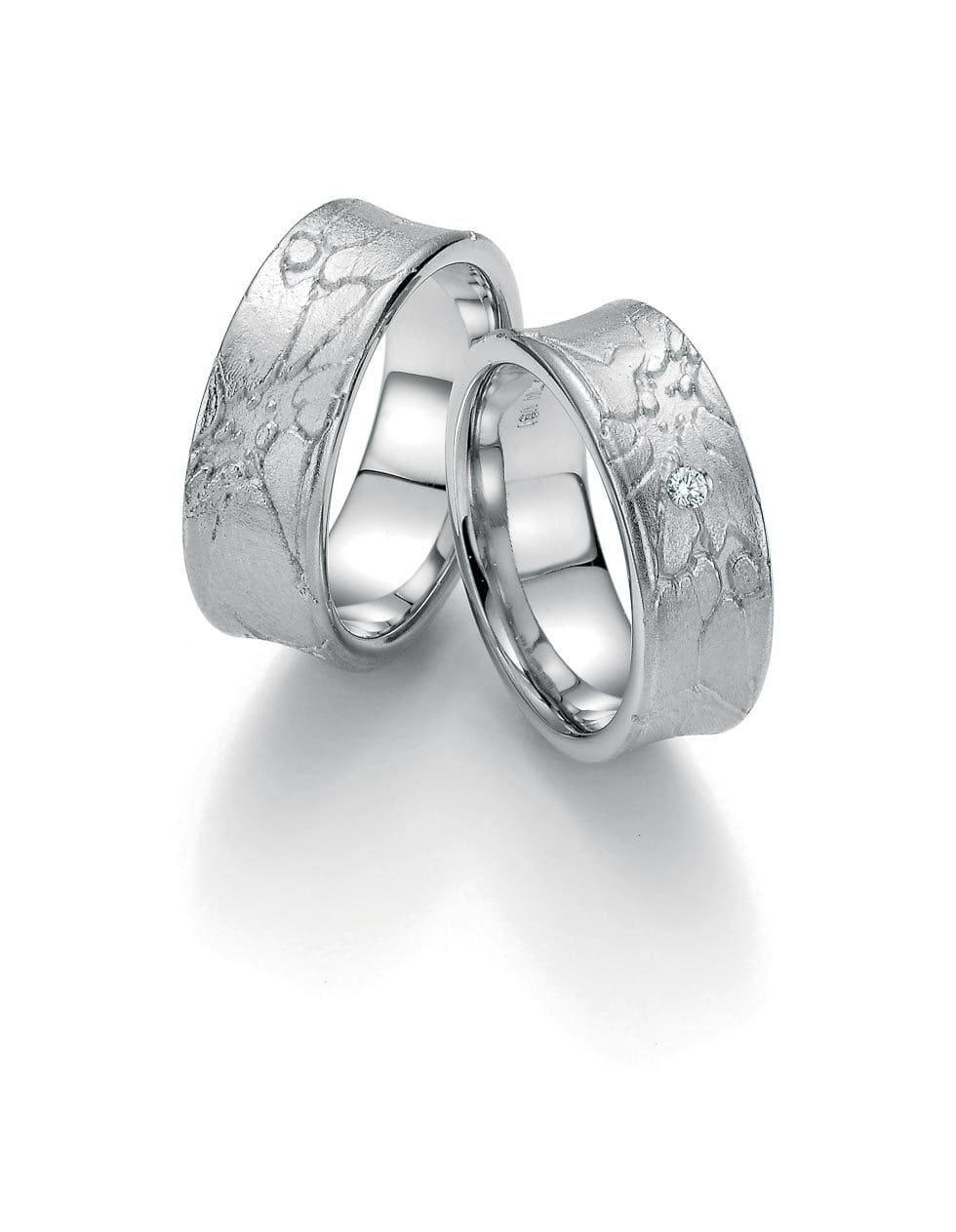 Aber auch die Kombination der verschiedenen silberfarbenen Gold-Farbnuancen Weiß, Grau und Haselnuss ergibt absolut moderne Designansätze weit ab vom klassischen Ehering.