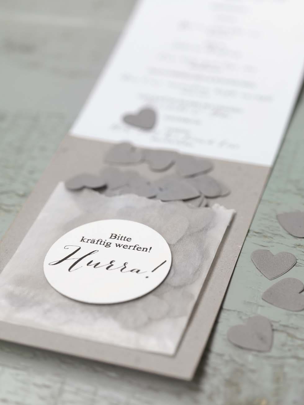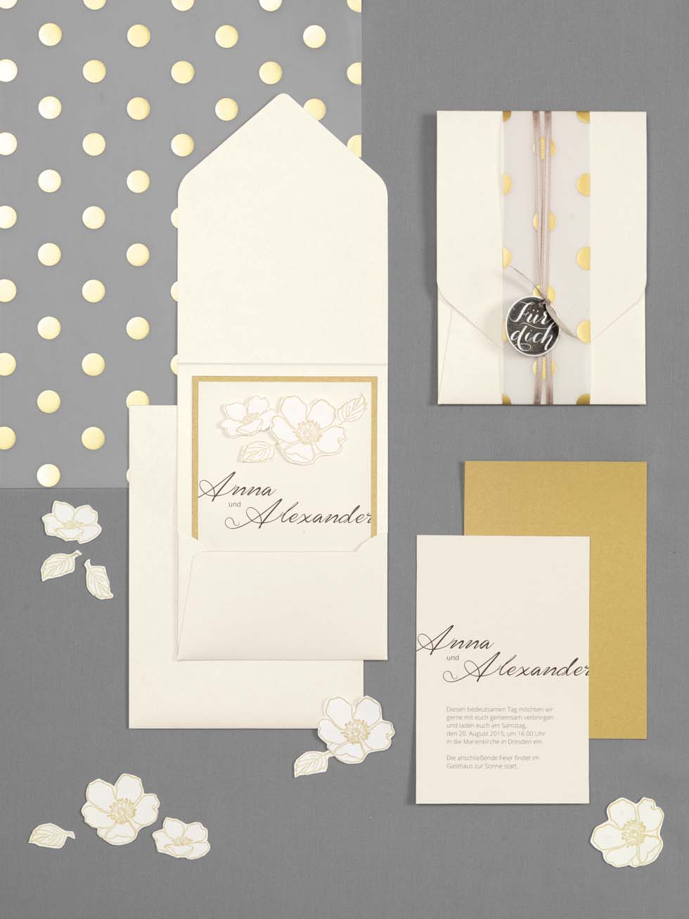 Eine Option wäre also, die Einladung zum Standesamt als einzelne Karte zu gestalten und für die große Feier eine als Kartenpäckchen erweiterte Karte oder eine Klappkarte zu verwenden.