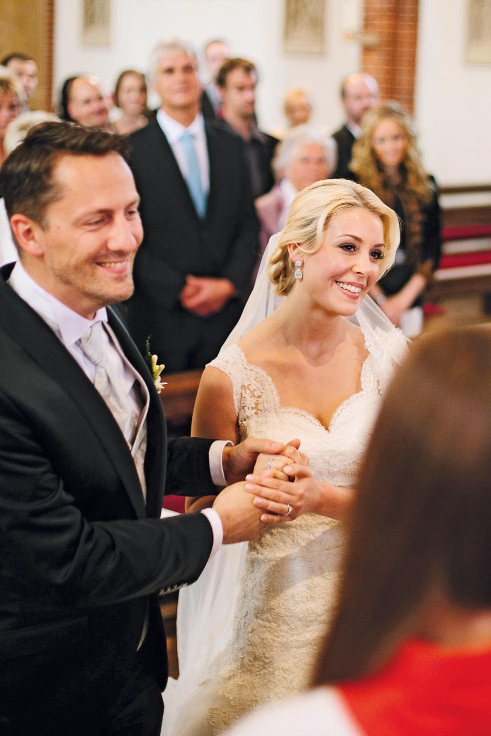 „Wir hatten immer eine genaue Vorstellung von dem, was wir wollten, obwohl wir es nicht geschafft haben, eine Hochzeitsmesse zu besuchen“, erzählen uns die beiden. Es sollte elegant, romantisch und doch schlicht und modern wirken. Deshalb entschieden sie sich dafür, alle Elemente in Weiß und Champagner zu gestalten.