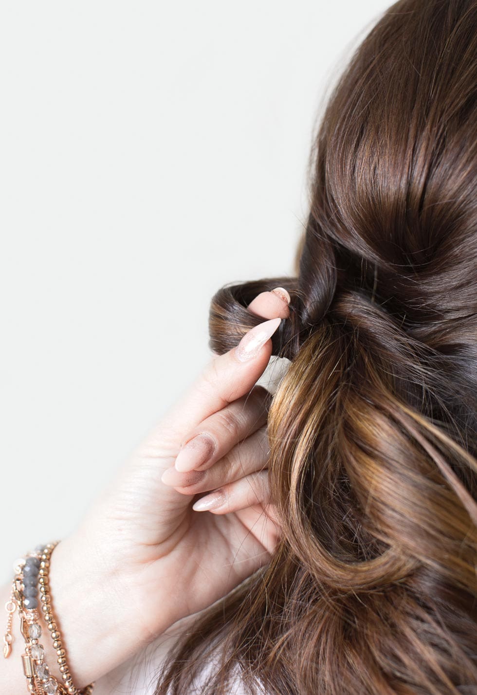 … und zieht die Strähne wieder oberhalb des Gummis nach unten. Mit diesen Schritten Strähne für Strähne fortfahren und lasst lediglich zwei seitliche Ponysträhnen übrig, damit diese zum Schluss locker als Finish gesteckt werden können.