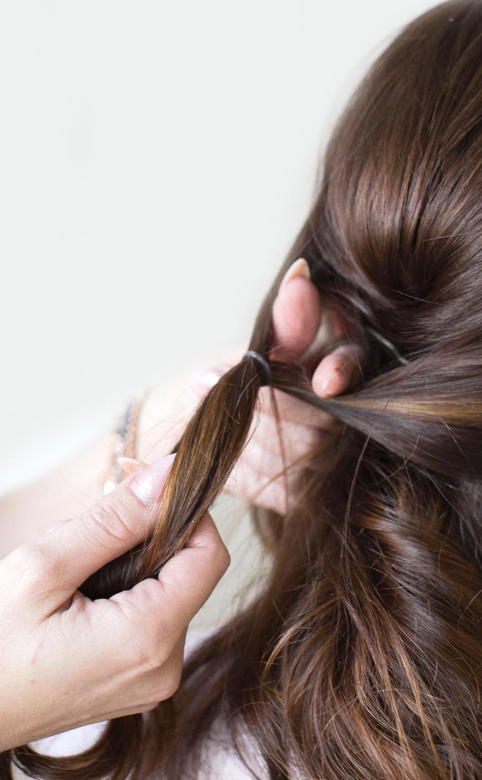 Nun greift ihr mit zwei Fingern zwischen beiden Strähnen oberhalb des Gummis nach dem Zopf unterhalb des Gummis, um ihn durch die Öffnung wieder nach unten zu führen