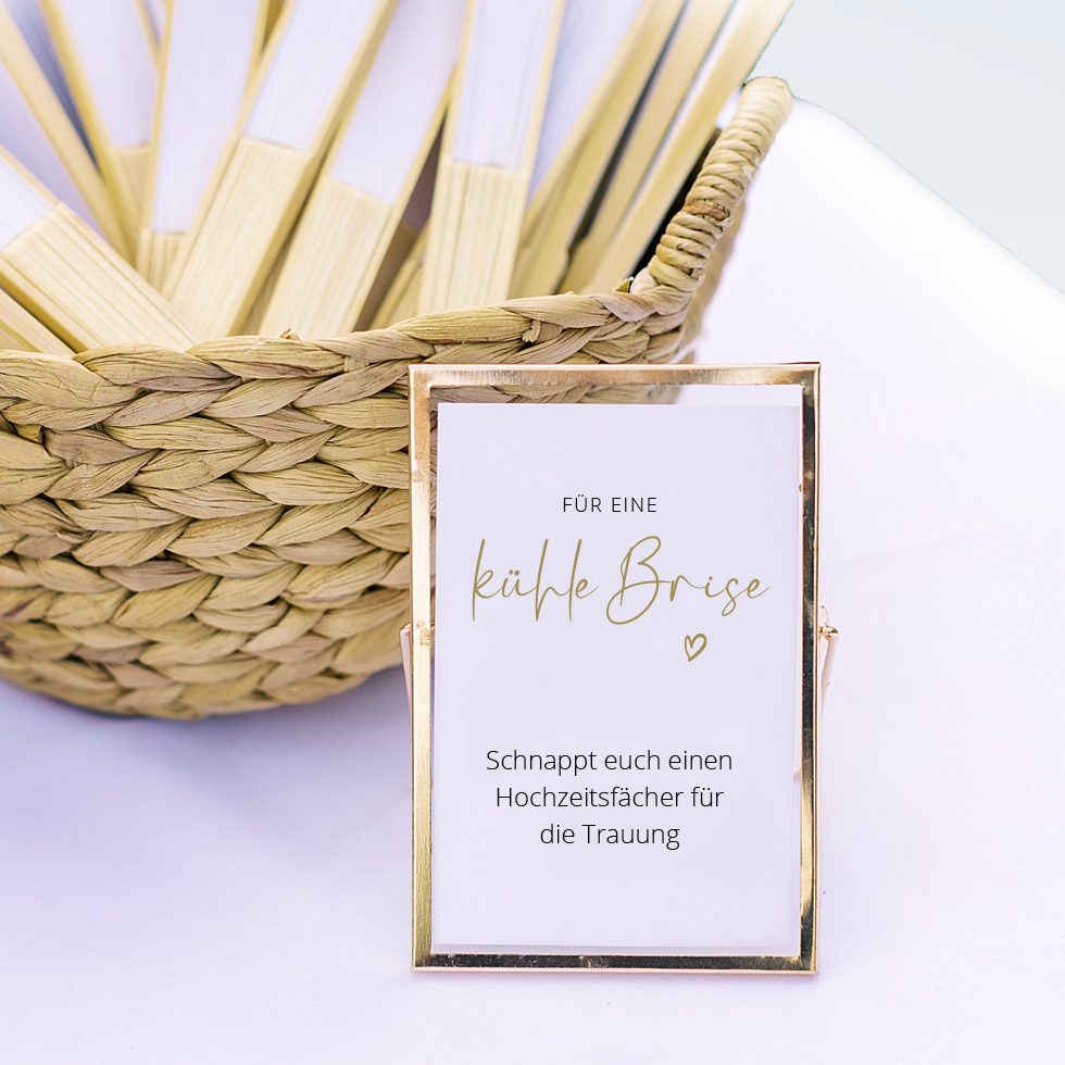 Ihr heiratet im Sommer, wenn beste Temperaturen angesagt sind? Dann denkt auch an eine kleine Abkühlung für eure Gäste. Denn sowohl bei der Trauung als auch bei der Feier sind eure Gäste bei eurer Hochzeit froh, wenn sie durch einen kleinen Luftzug Abkühlung erhalten – zum Beispiel durch einen liebevoll gestalteten Fächer.