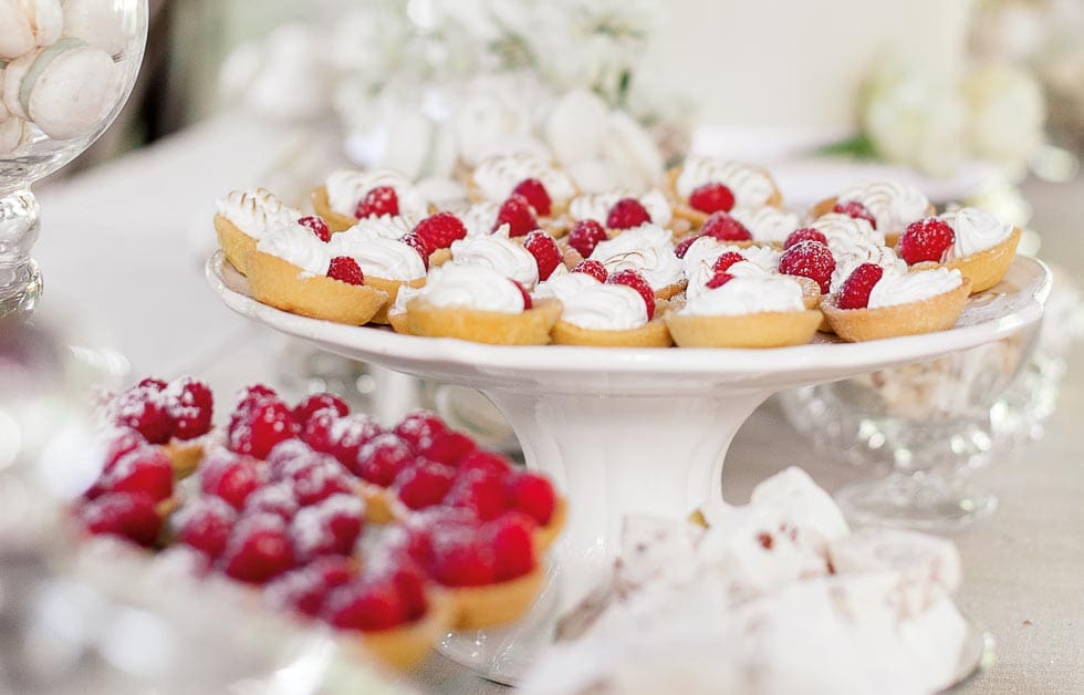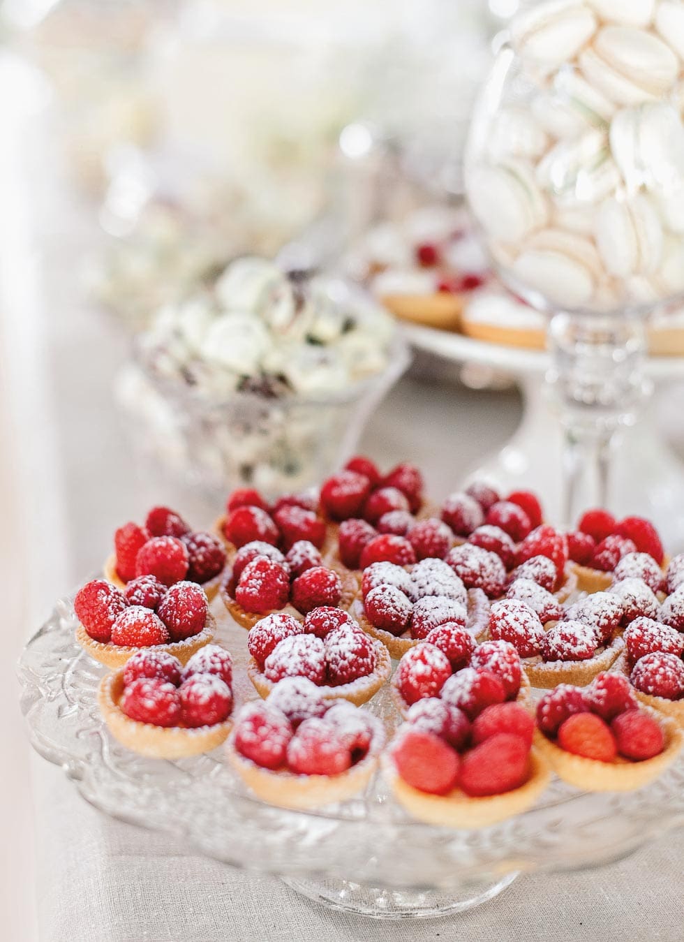 Die rote, saftige Biskuitschicht kommt erst beim Anschneiden zum Vorschein und ergänzt einen echten Wow-Effekt. Dieses kleine rote Detail wurde für das gesamte Konzept des Dessertbuffets übernommen und mit leckeren Erbeeren und Himbeeren realisiert.