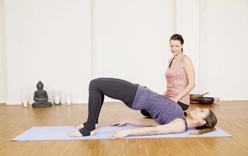 Aus der Rückenlage das Becken so hoch anheben, dass der Körper eine diagonale Linie bildet. Das Körpergewicht ruht auf den Schulterblättern.