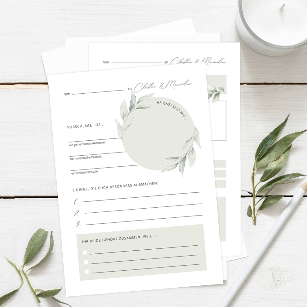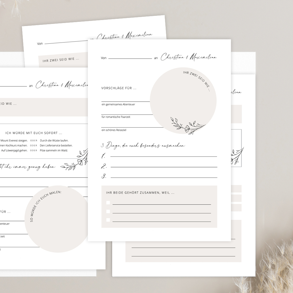Gestaltet euer Gästebuch für die Hochzeit ganz individuell mit tollen Aufgaben und druckt die Seiten selbst auf dickes Papier – im Copyshop oder auf eurem Heimdrucker.