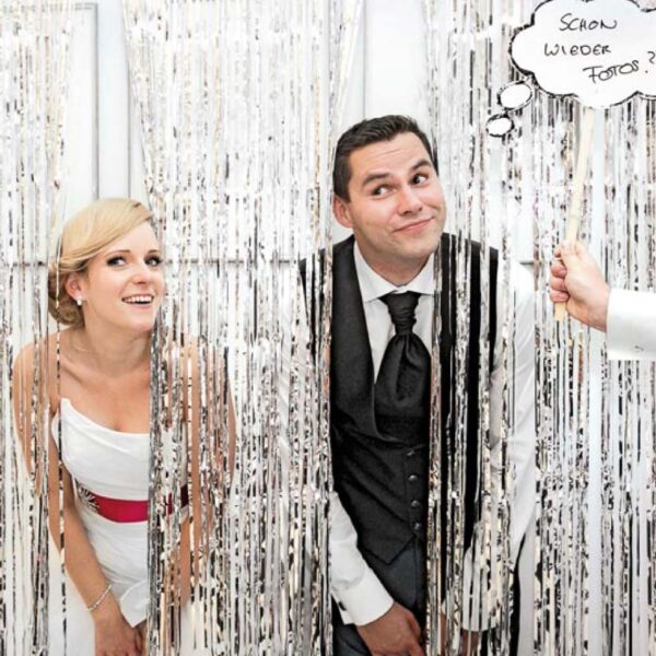 Während ihr zum Fotoshooting verschwunden seid, könnt ihr eure Gäste wunderbar mit einer Photo Booth bestens unterhalten. Das hat zusätzlich den Vorteil, dass ihr euch nicht um die Lichtquelle sorgen müsst. Hier reicht eine einfache Kamera auf einem Stativ aus.