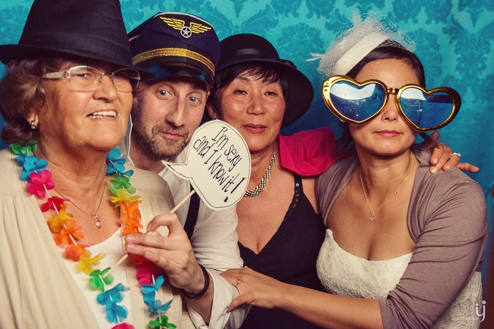 Mit witzigen Accessoires wie Hüten, Brillen, Mützen, Perücken und sonstigen Verkleidungsstücken verlieren die Gäste schnell die Hemmung vor der Kamera und haben noch mehr Spaß beim Fotomachen.