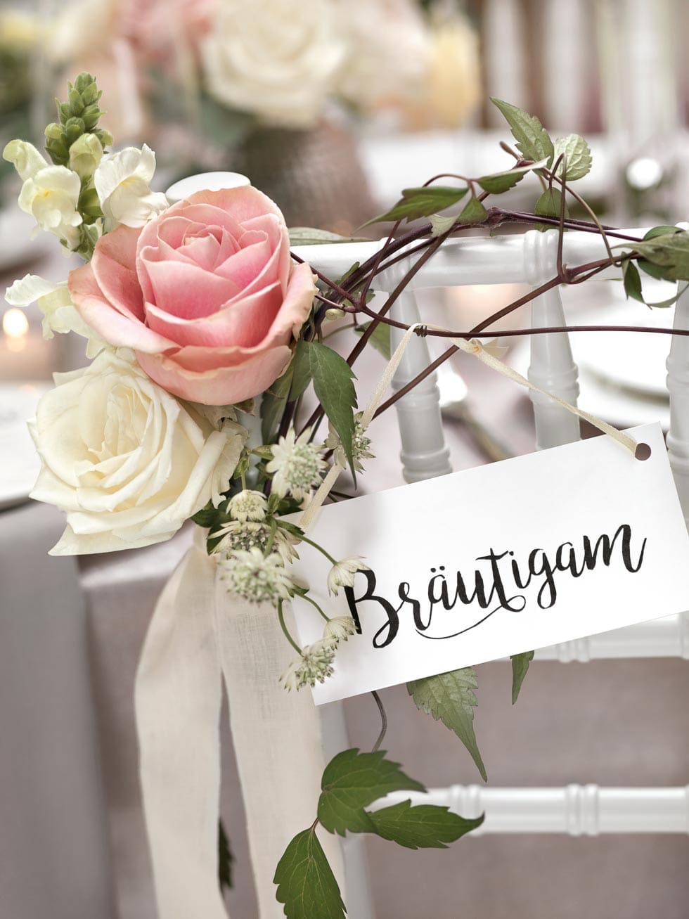 Hier findet ihr verschiedenste Ideen für die Stuhlschilder des Brautpaars sowie Tipps, um besonderen Gästen bestimmte Plätze freizuhalten.