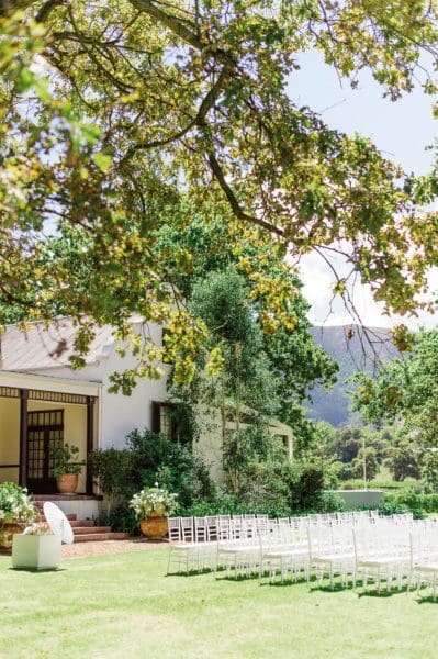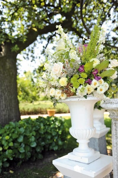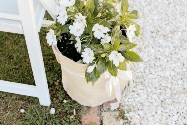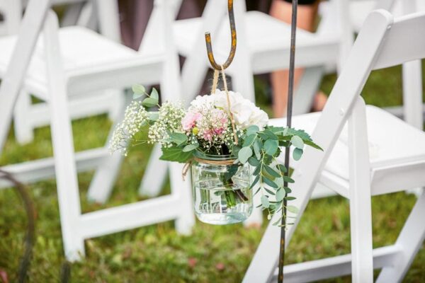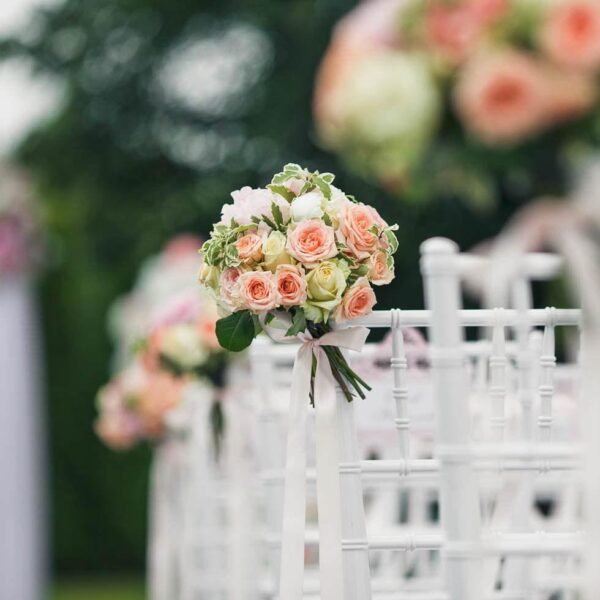 Lasst die Blumendekoration erst kurz vor der Trauung an den Stühlen anbringen. Denn an heißen Tagen lassen die Blüten ohne Wasserversorgung schnell die Köpfe hängen.