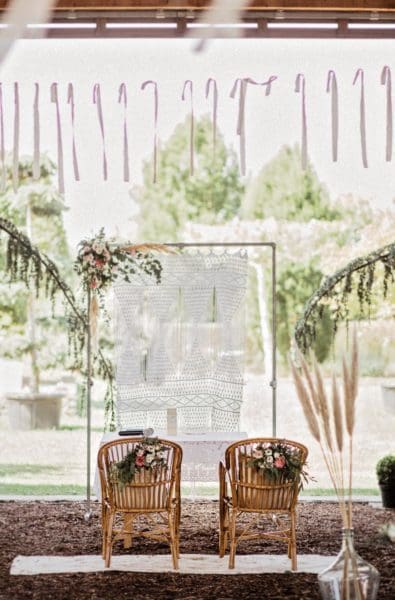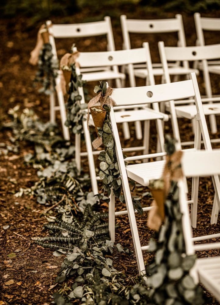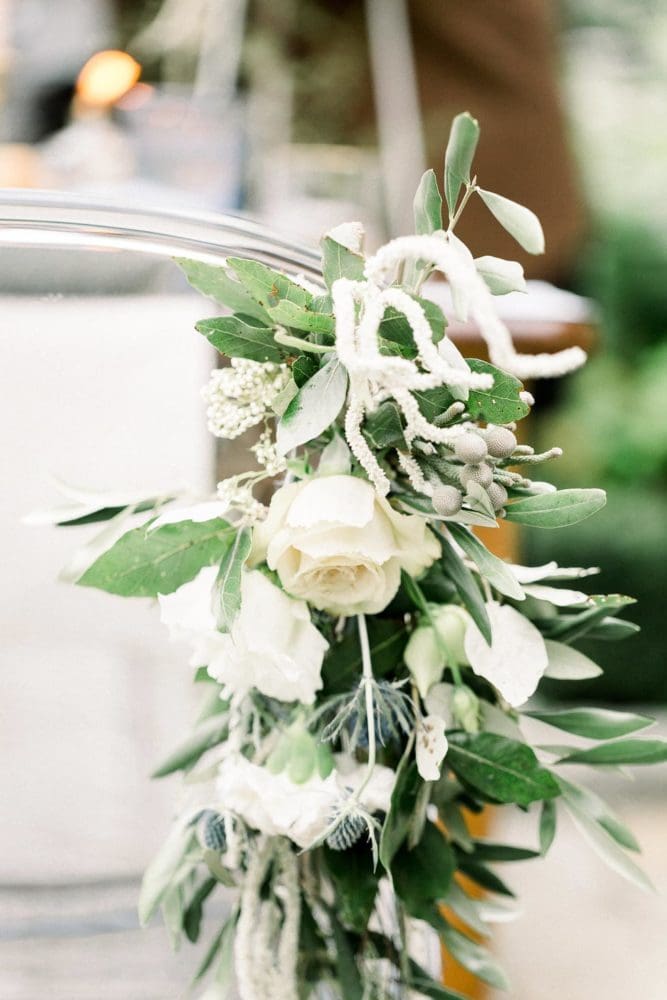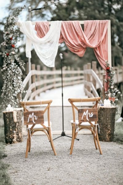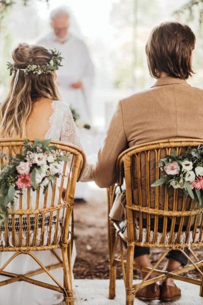 Dekoriert die Stühle für das Brautpaar etwas üppiger mit Blumenranken oder Arrangements und ergänzt noch optional hübsche Stuhlschilder.