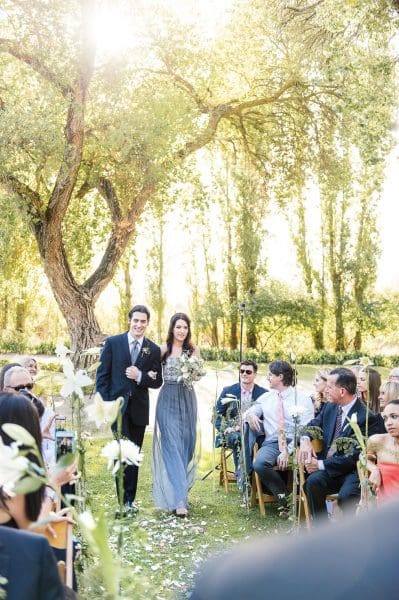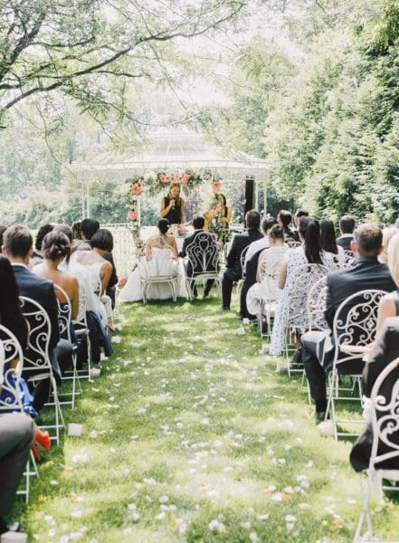 Wenn ihr Blumen gestreut oder einen weißen Teppich ausgelegt habt ist es sinnvoll, den Mittelgang vor der Trauung mit einem Band abzusperren, damit die Gäste von außen auf ihre Plätze gehen. So bleibt alles für den Einzug des Brautpaars traumhaft schön.