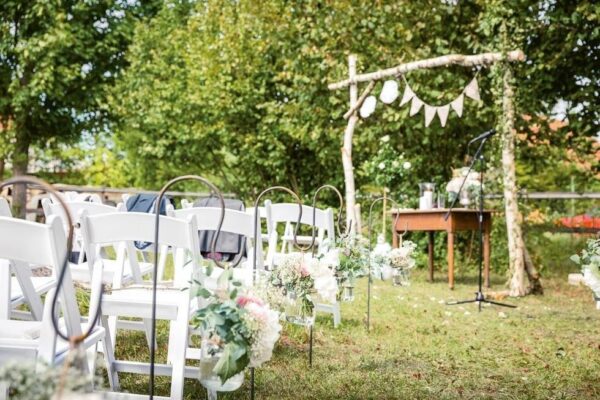 Doch wie wäre es, die Stühle einmal als Bogen oder Spirale anzuordnen oder die Stühle des Brautpaars so zu platzieren, dass sie die Gäste ansehen? Eine weitere schöne Idee ist, die Stuhlreihen der Gäste kreisförmig um das Brautpaar anzuordnen.