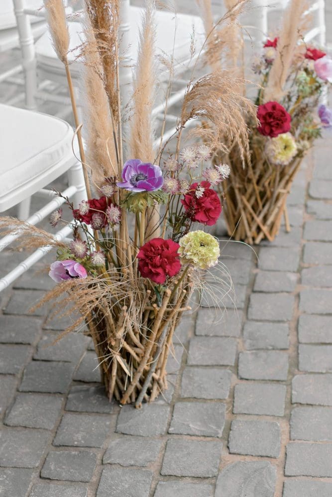 Auch hier habt ihr wieder die verschiedensten Optionen für die Gestaltung, die wir euch hier vorstellen – von einfachen gestreuten Blüten über Mittelgang-Läufern bis hin zu aufwendigen Blumendekorationen.