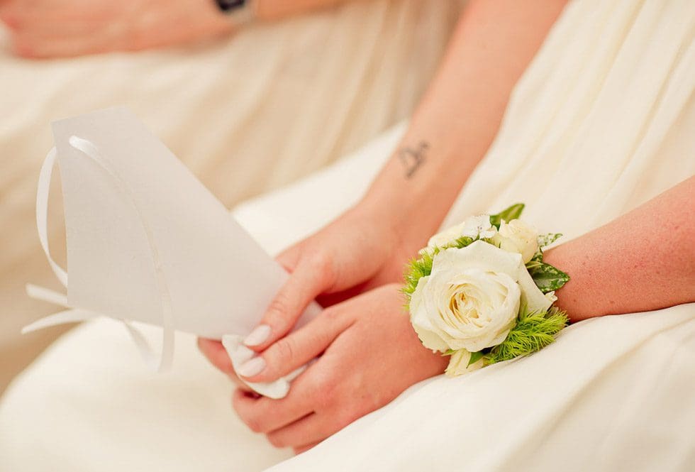Jessica bedankte sich bei ihren Brautjungfern für ihren Einsatz am Hochzeitstag mit kleinen Sträußen, die am Handgelenk befestigt wurden.