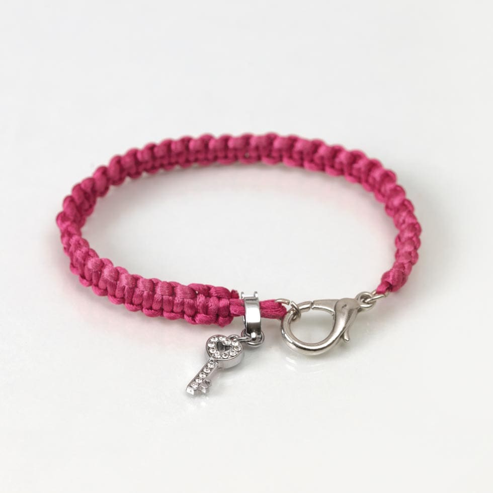 Auch hier haben wir ganz einfache Armbänder erstellt. Mit einer schönen Knüpftechnik (siehe Anleitung Seite 222) erhält man aus einem einfachen Kunstseideband, das in vielen Farben erhältlich ist, ein eher typisches Freundschaftsband. Mit einem silbernen Karabinerverschluss und einem Clip-Anhänger wird es dennoch dem Anlass entsprechend aufgepeppt.