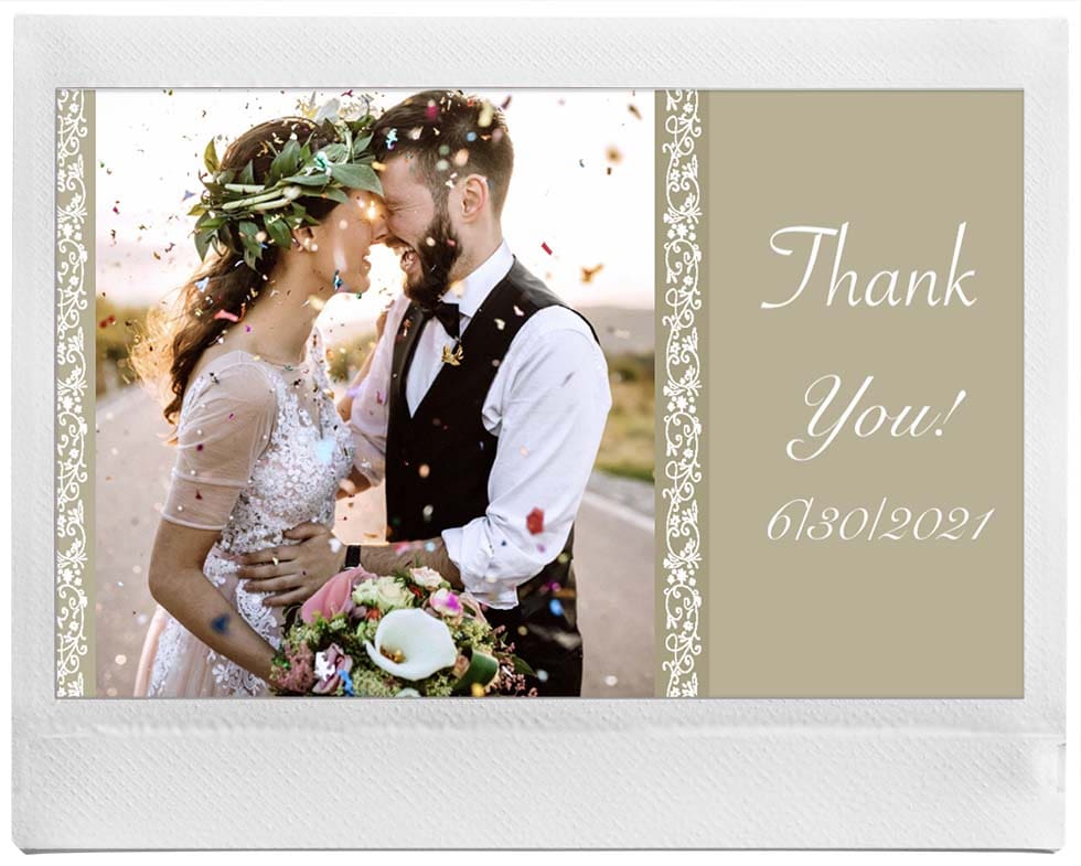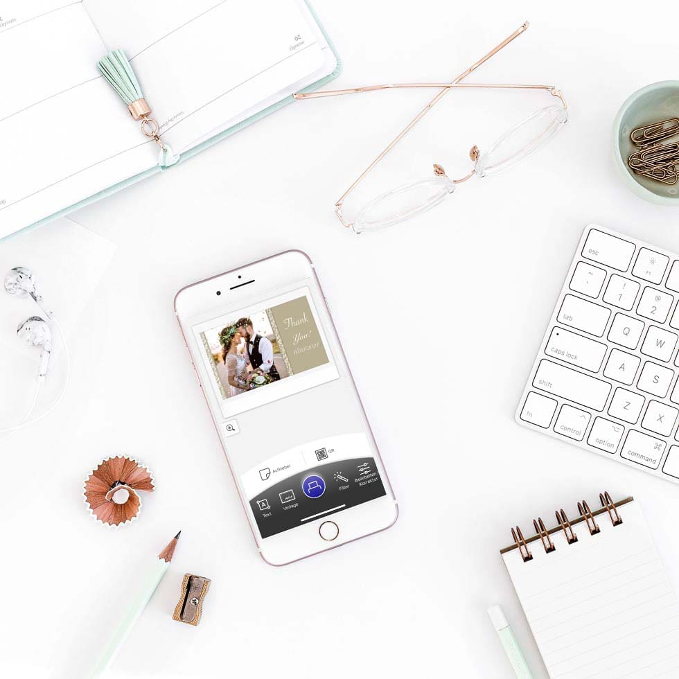 Damit ihr ruckzuck eine wunderschöne Dankeskarte erstellen könnt, eignet sich der FUJIFILM instax Link WIDE Printer perfekt. Sucht euch einfach euer liebstes Hochzeitsfoto aus und schwupps sind die Dankeskarten sogar mit einem Klick 60-mal ausgedruckt.