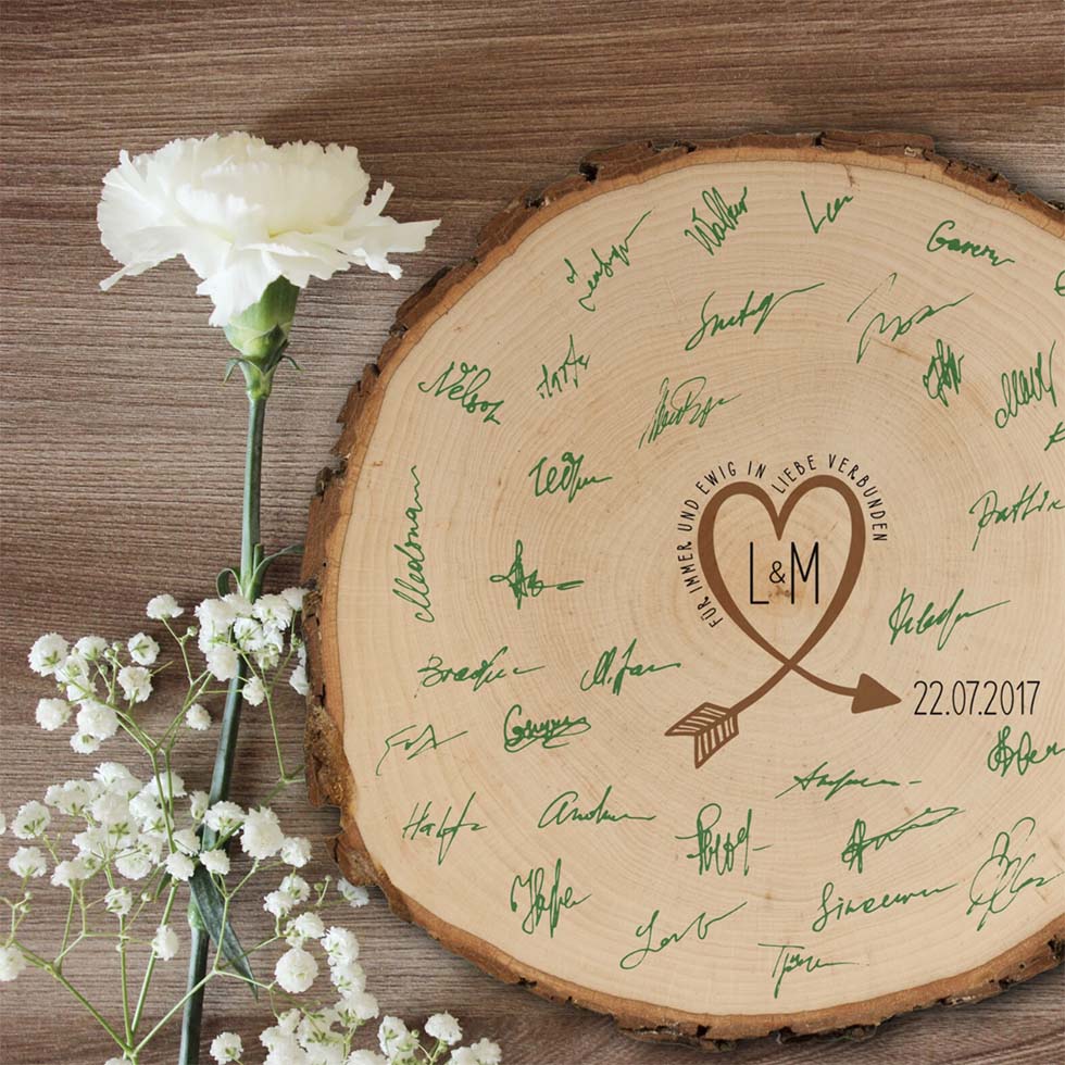 Rustikaler geht’s kaum: Eine große, runde Baumscheibe mit euren Namen und dem Hochzeitsdatum wird zum Mittelpunkt eures Gästebuchs. Eure Gäste unterschreiben darauf mit einem feinen Marker – direkt auf dem Holz. Diese Variante passt ideal zu Scheunenhochzeiten, Boho- oder Waldthemen.