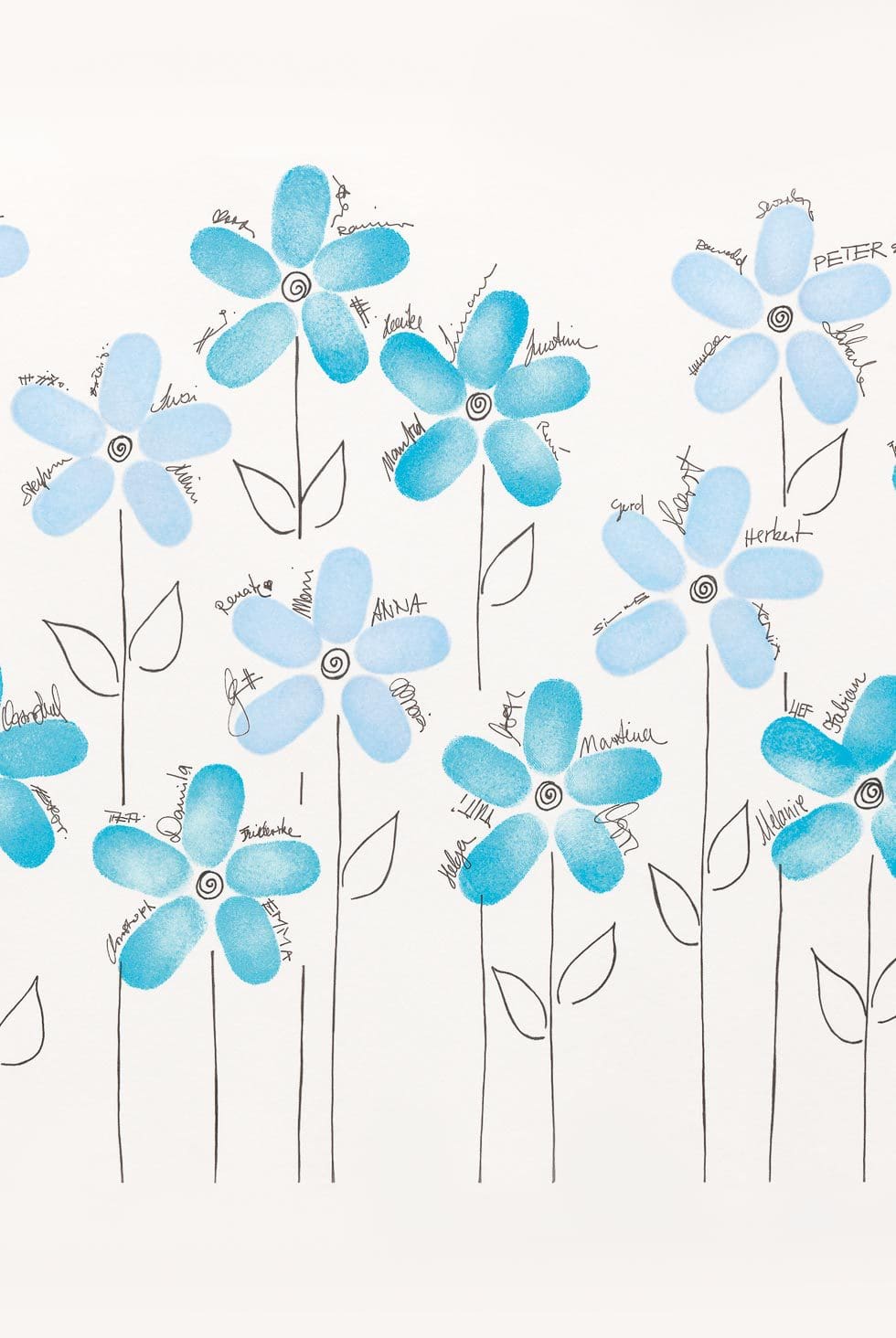 Statt der üblichen Motive könnt ihr eure Gäste eine wunderschöne Blumenwiese mit ihren Fingerabdrücken gestalten lassen.