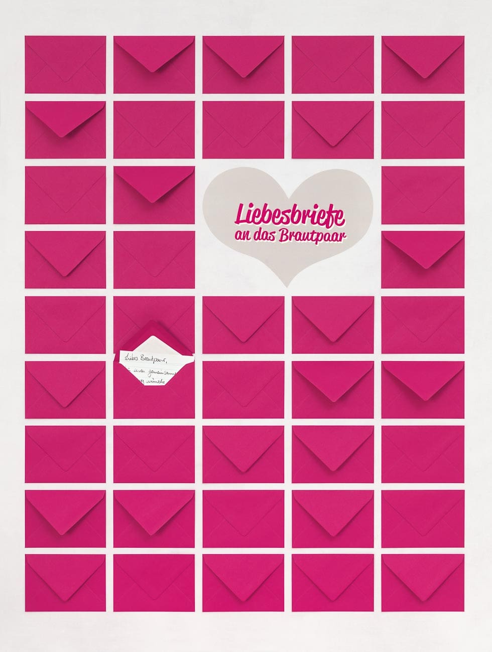 Alles, was ihr für dieses hübsche Gästebuch benötigt, sind Mini-Kuverts, passende Karten sowie ein Herz, das auch mit euren Namen beschriftet werden kann.