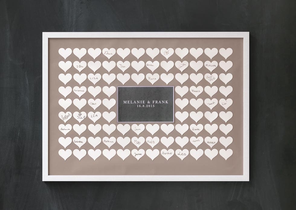 Herzen, die in hübschen Rahmen aufbewahrt werden, sind aktuell der Renner unter den Hochzeitsgästebüchern, denn mit ihnen werden die Unterschriften eurer Gäste zu genialen Deko-Elementen.