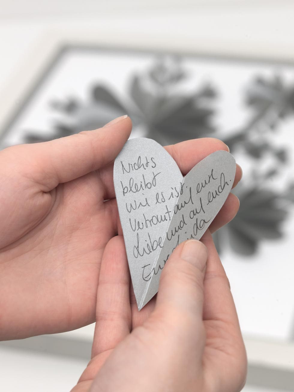 Jetzt könnt ihr die Vorlage aufzeichnen, dass ihr unzählige Herzen im Handumdrehen ausschneiden könnt. Zum Schluss werden die Herzen nach dem Beschriften zur Blume arrangiert auf einen Bilderrahmen geklebt. Ein großartiger Effekt!