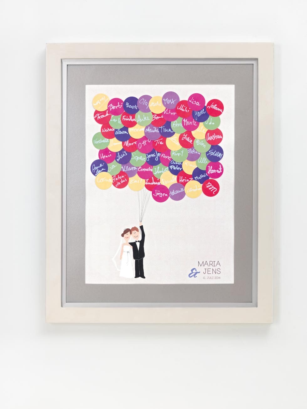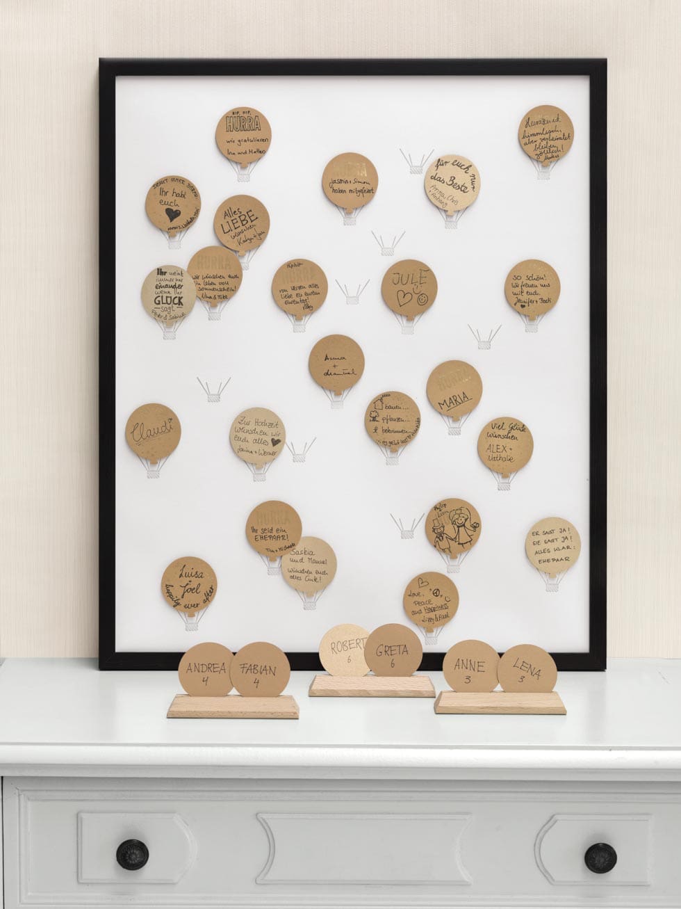 Anschließend hinterlässt jeder auf der Rückseite einen Gruß oder Wunsch für das Brautpaar und klebt seinen Ballon auf das Gästebuch Bild.