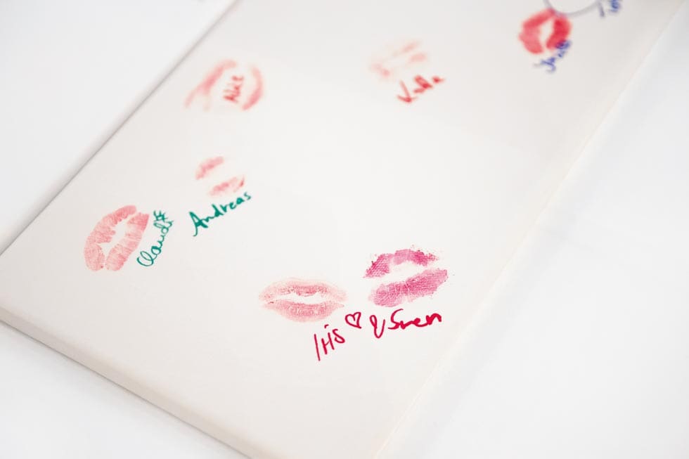 Das macht ebenfalls riesigen Spaß: Lasst die Damen ihren Lieblings-Lippenstift zücken und damit einen Knutscher für das Brautpaar auf einer Leinwand einfachen weißen hinterlassen.