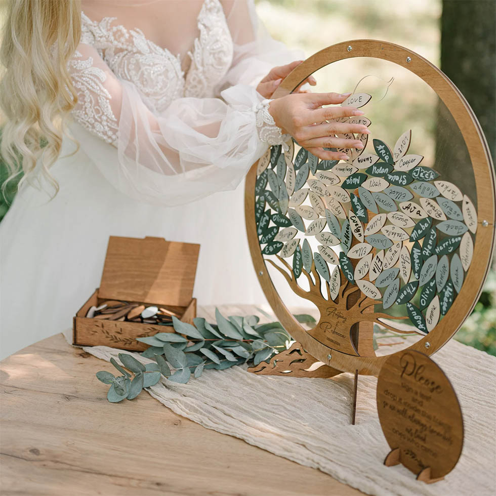 Ob Deko-Objekt, Holzplatte oder aufwendig gelaserte Bilder – Gästebücher aus Holz für die Hochzeit sind durch ihren natürlichen Charakter und ihren nachhaltigen Erinnerungswert als Deko-Objekt einfach großartig!
