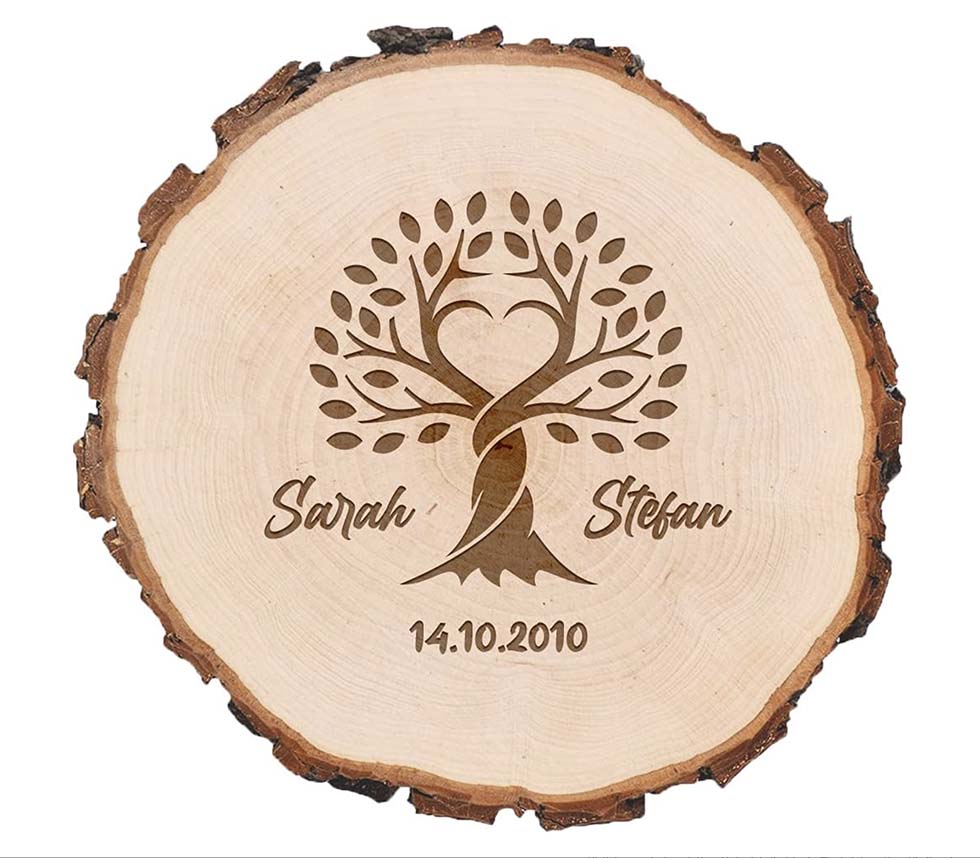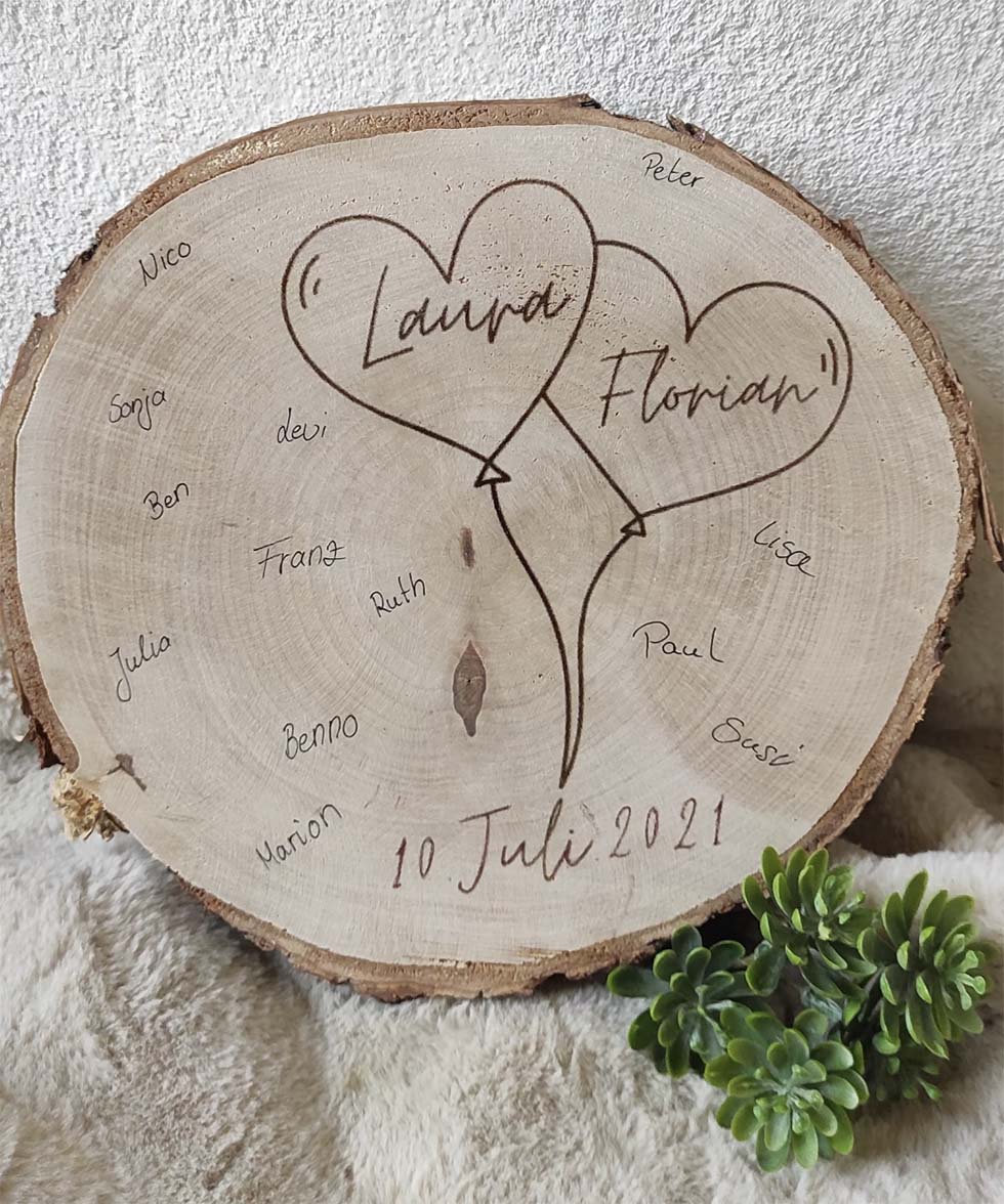 Ebenfalls ein beliebtes Deko-Element sind Baumscheiben, die auf verschiedene Weise graviert und mit den Namen des Brautpaars personalisiert werden können: