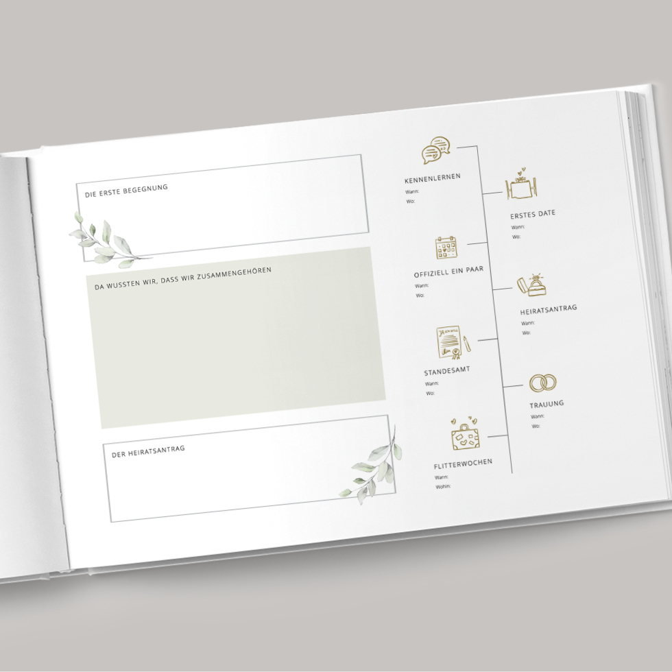 Gestaltet als nächstes im Gästebuch eine Doppelseite mit Bildern sowie zum Beispiel einem Zeitstrahl eurer Geschichte mit liebevollen Erinnerungen, die eure Gäste mögen werden.