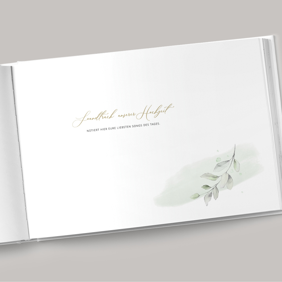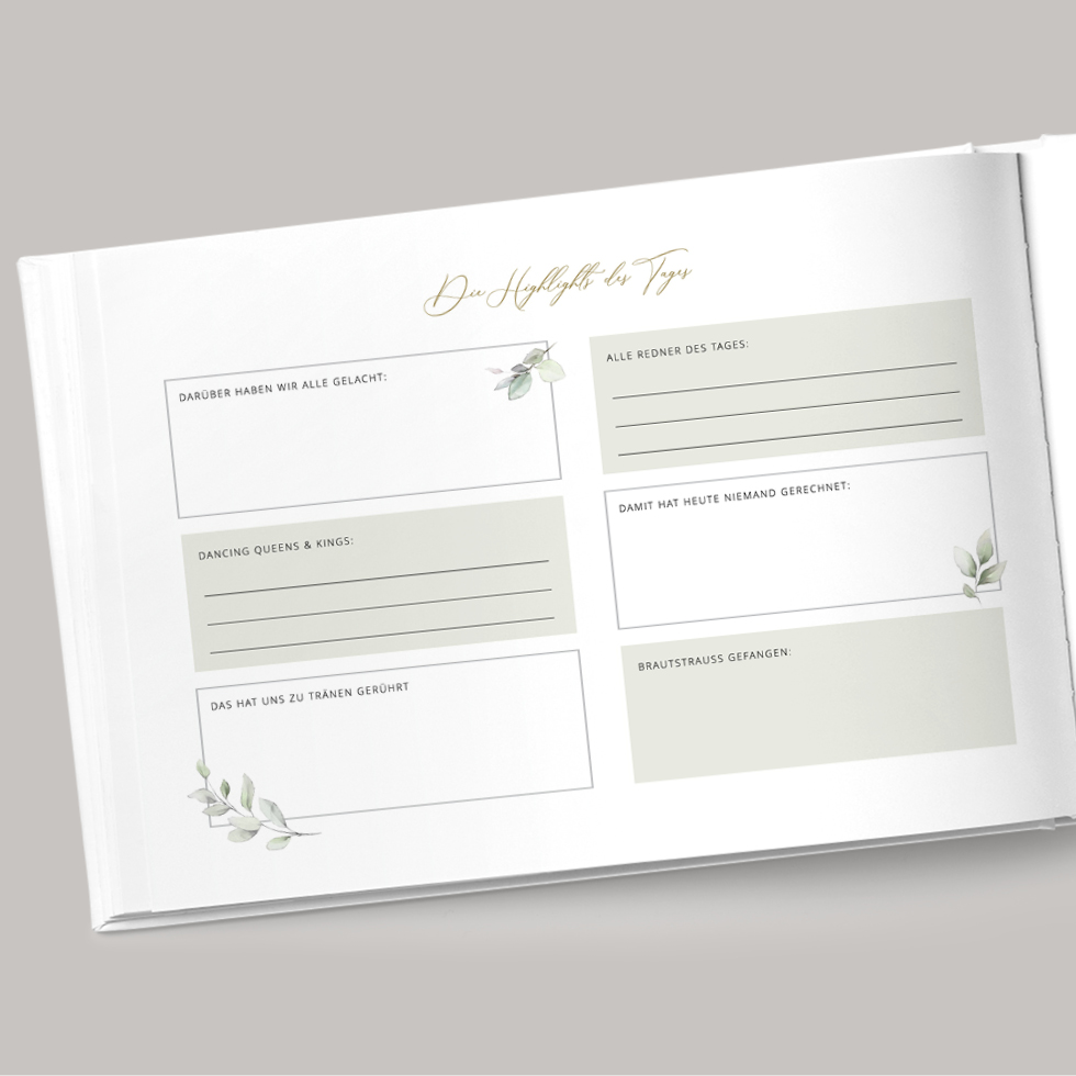 Eine Liste in denen ihr nach bestimmten Highlights des Tages und tollen Beiträgen der Gäste fragt oder eine Seite, die den Soundtrack des Tages festhält – das sind die Elemente, die euer Gästebuch für immer unvergesslich schön gestaltet.