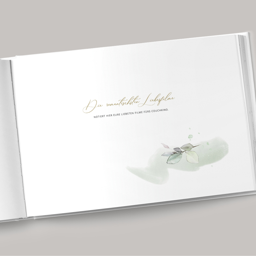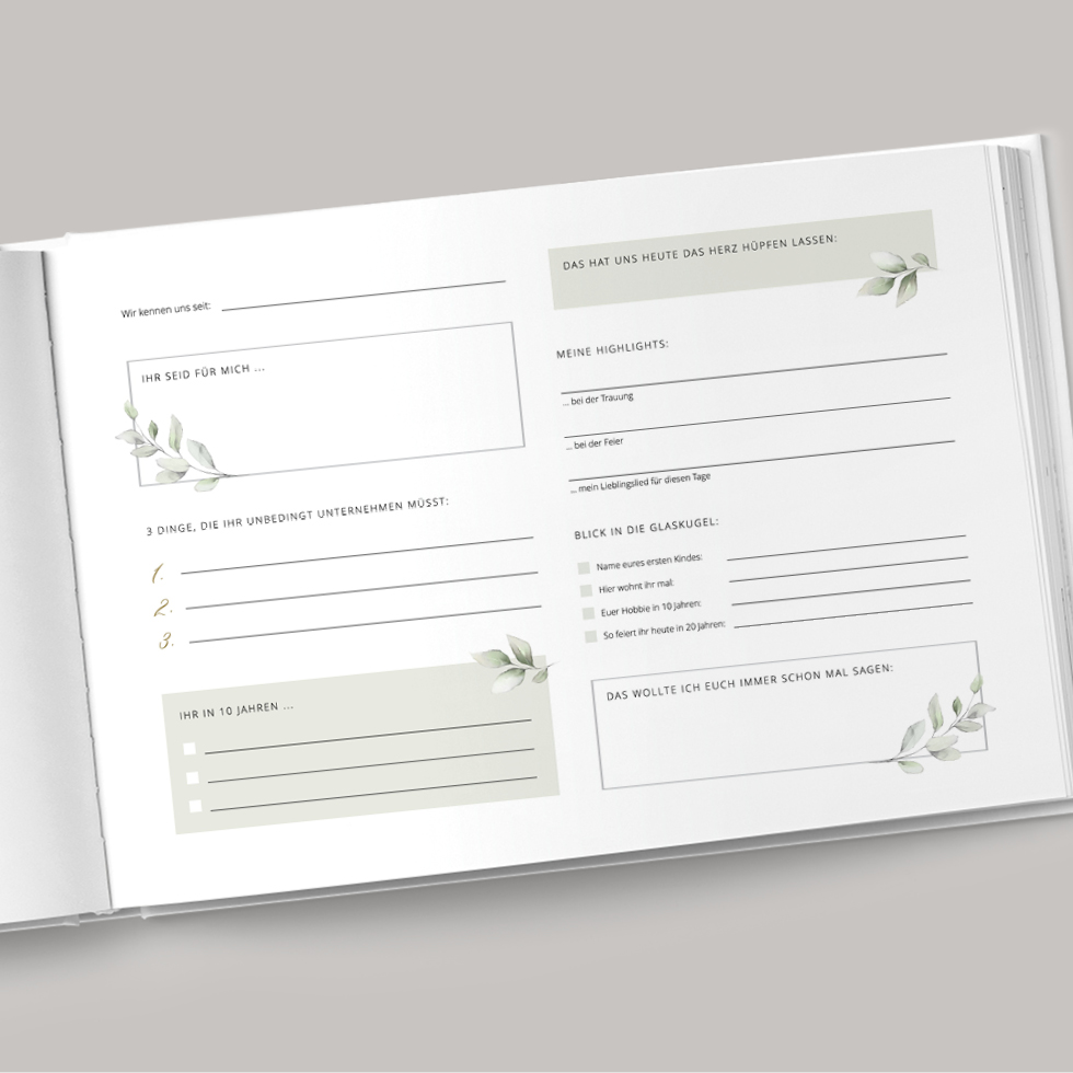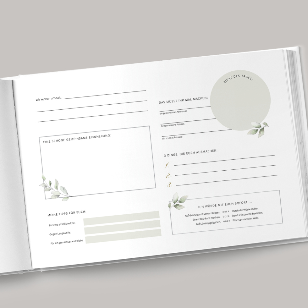 Zusätzlich könnt ihr das Gästebuch mit ganz persönlichen Anekdoten, Zitaten oder speziellen Fragen wirklich besonders machen.