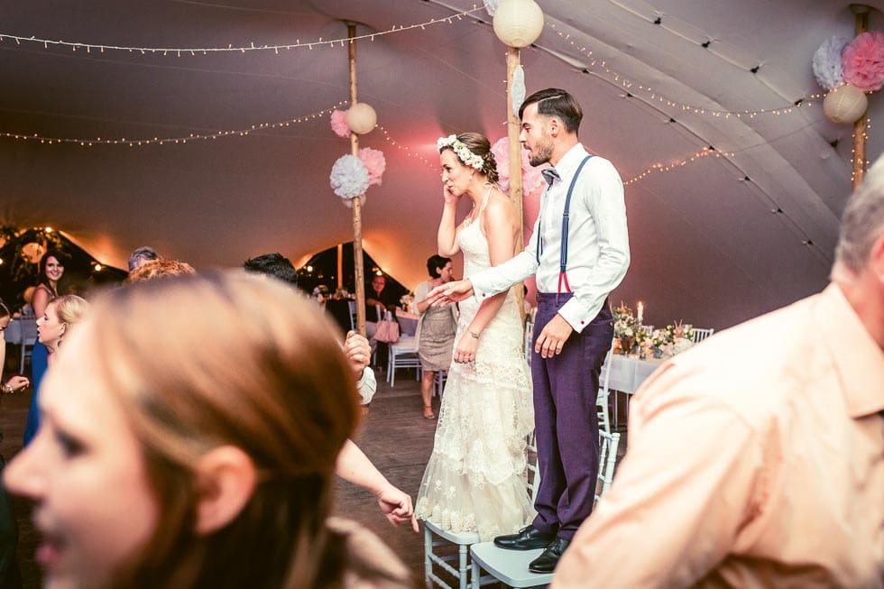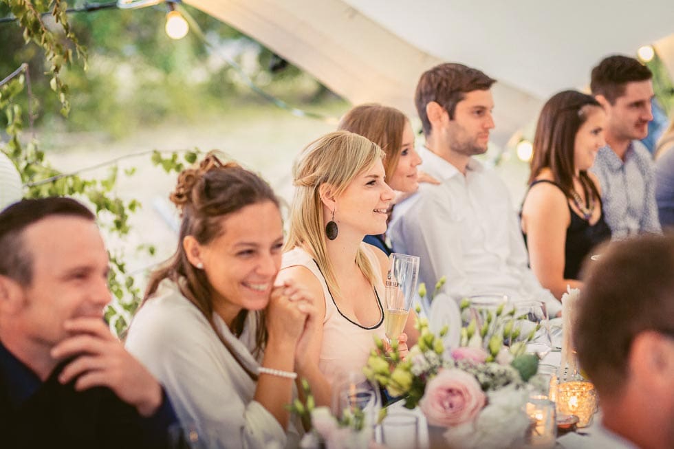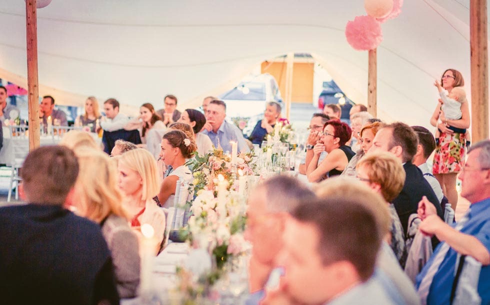 Natürlich hatten wir auch einen Plan B im Ärmel: Die Trauung konnte überdacht werden und das Zelt hätte ganz dicht gemacht werden können, aber wir wollten den Glauben an schönes Wetter nicht aufgeben. Sobald die Wetterberichte verfügbar waren, haben wir sie alle fünf Minuten aktualisiert und stets demjenigen geglaubt, der das beste Wetter angekündigt hat.“