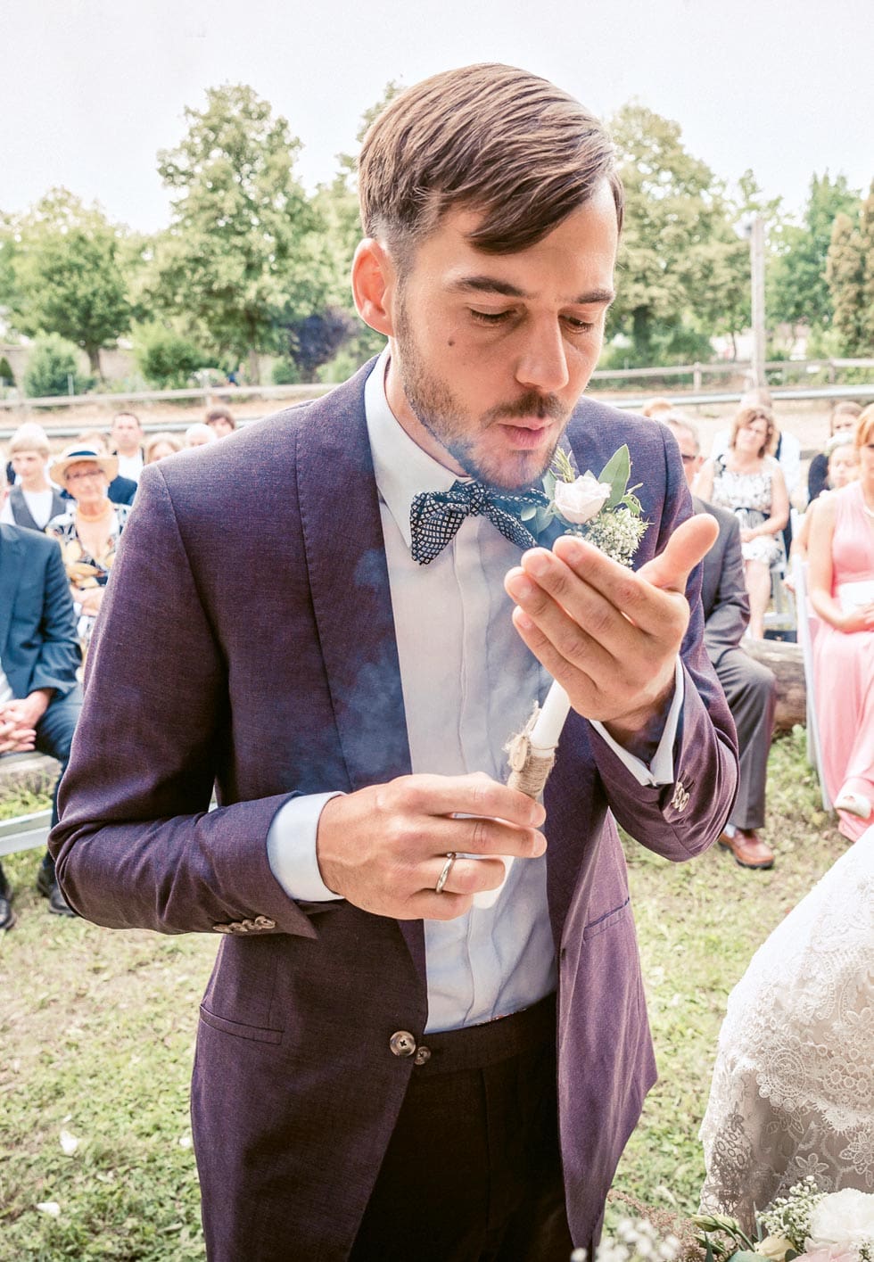 „Eine lustige Situation ergab sich während der Trauung: Gerade in dem Moment, als unsere Freunde Ihre guten Wünsche an uns vortrugen, fing in dem ca. 200 m Luftlinie entfernten Kirchengarten das Blasorchester an in voller Lautstärke ‚Smoke on the water‘ zu schmettern. Dies passte so absolut gar nicht in unsere Situation, dass alle lauthals anfingen zu lachen.“