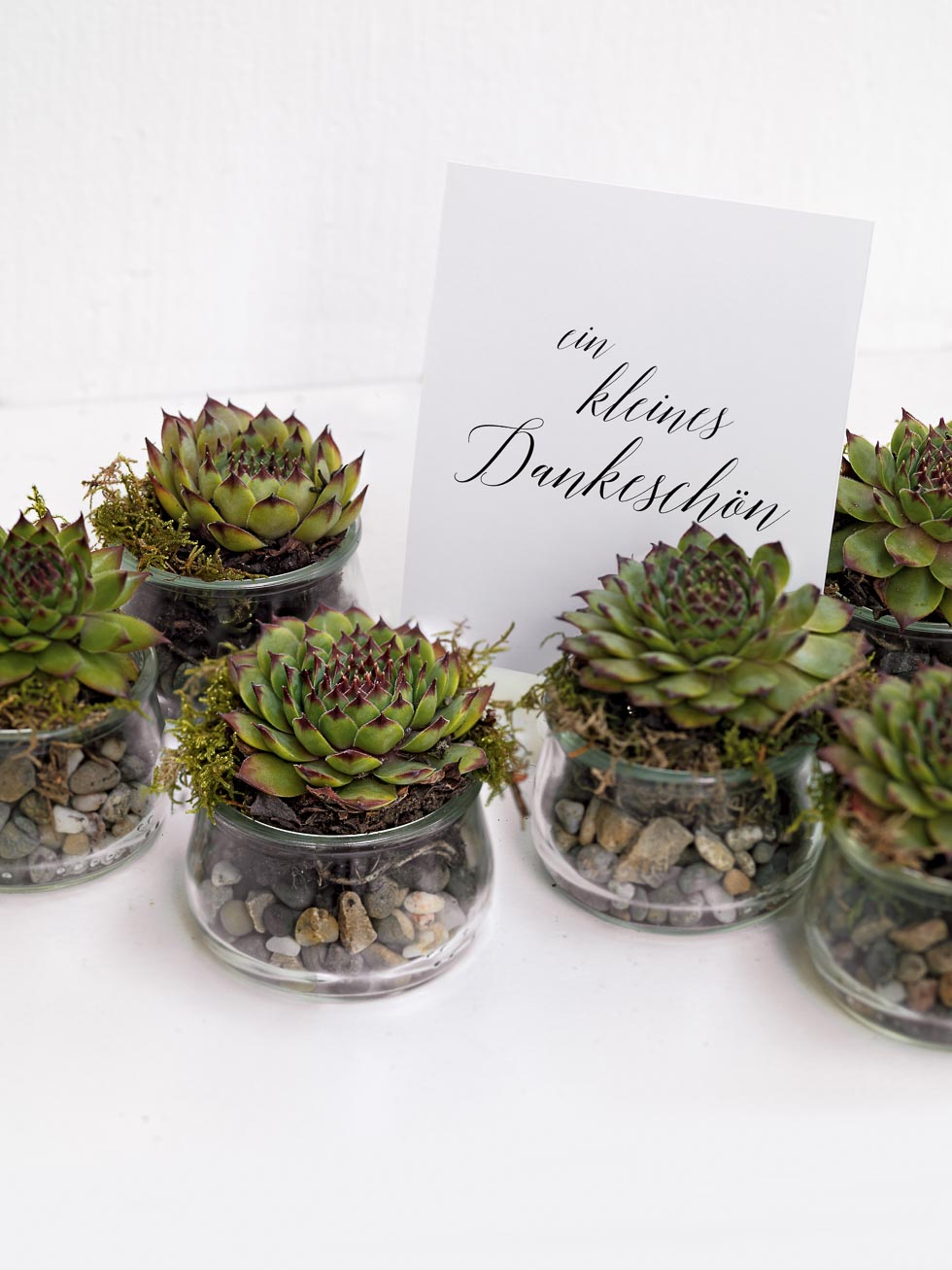 Pflanzt sie je nach Hochzeitskonzept in kleine Terrakotta- oder Zinn-Übertöpfe und ergänzt noch einen → hübschen Anhänger mit liebevollem Spruch und schon werden sie zum atemberaubenden Gastgeschenk.