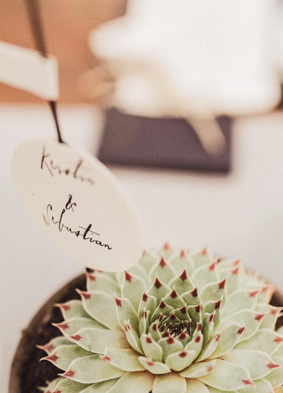 Stellt die Gastgeschenke in Reih und Glied auf einen Tisch im Eingang bereit und verseht sie mit einem Namensschild-Anhänger, der auch die Tischnummer aufgedruckt hat. So könnt ihr eure Gastgeschenke gleichzeitig als Sitzplan bei der Hochzeit nutzen.