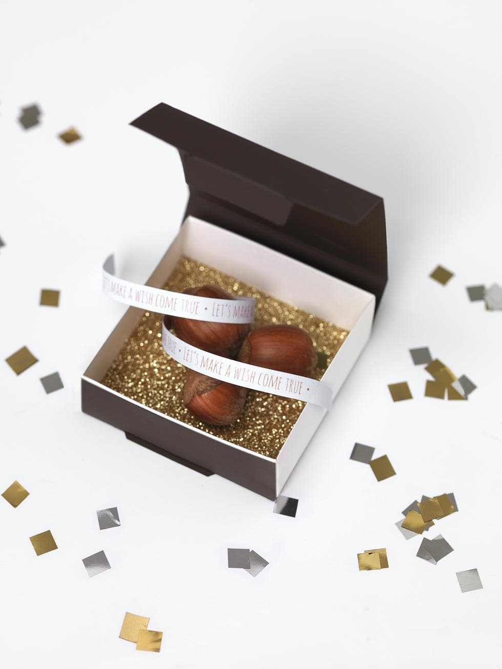 Hinein legt ihr drei Haselnüsse und ein selbst beschriftetes Papierband mit "Let's make a wish come true".