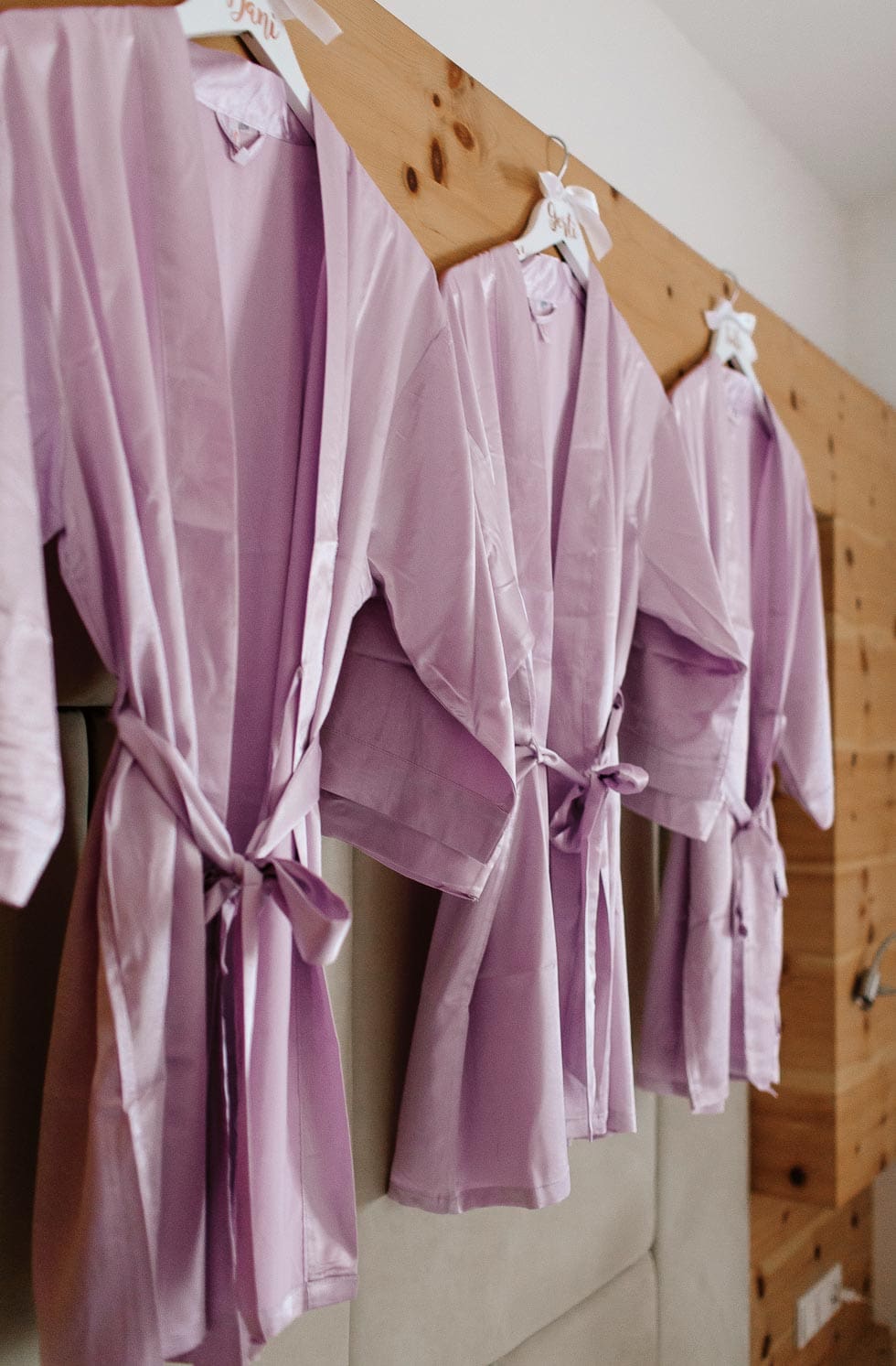 Richtig cool ist es auch, wenn eure Brautjungfern mit Bademäntel in der gleichen Farbe tragen. Das sieht nicht nur auf den Fotos klasse aus, sondern gibt euren Mädels ein großartiges Team-Gefühl und dient als großartiges Geschenk – gemeinsam mit ein paar kleinen lieben Aufmerksamkeiten.