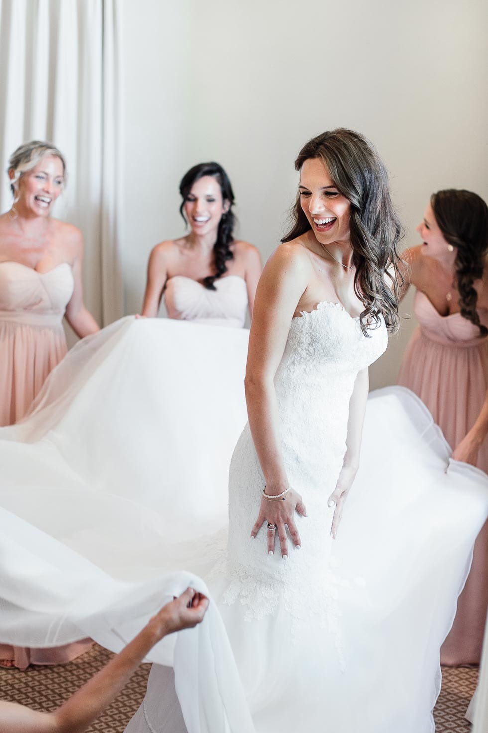 In eine Brautkleid kann man nicht einfach wie in ein Sommerkleid schlüpfen. Lasst euch deshalb von eurer Mama, der Trauzeugin oder eueren Brautjungfern beim Anziehen helfen.